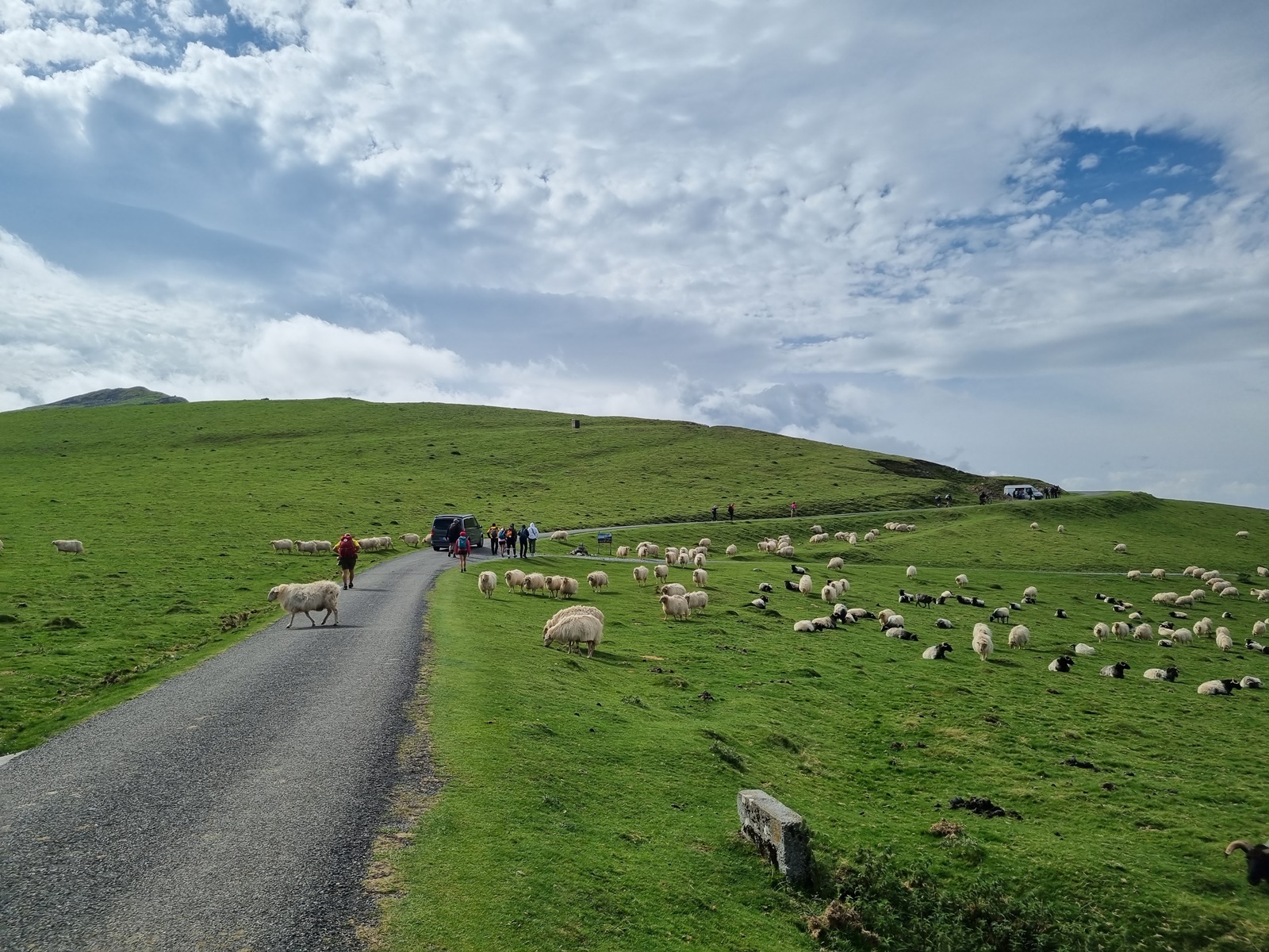 피레네 산맥 정상 능선으로 올랐지만 완만한 오르막이 계속된다. 푸르른 초지에 양떼와 말들이 무리지어 풀을 뜯는 풍경이 이색적이다. 십자가 기념비에서 암릉으로 이루어진 언덕을 하나 넘으면 프랑스-스페인 국경지대로 내려서게 된다