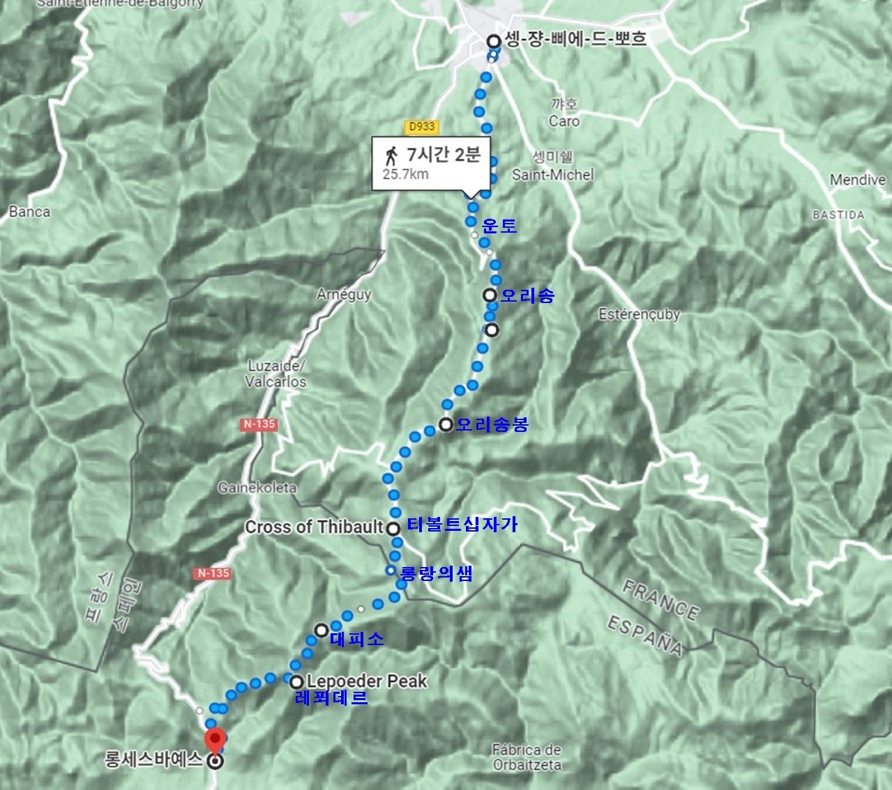 생장피르포르 –5.6- 운토 –2.4- 오리송 –3.8- 오리송봉 –3.6- 십자가 –1.6- 국경 –4.1- 콜데레푀데르(1,427m) –4.0- 론세스바예스 | 25.1㎞ 9시간 |