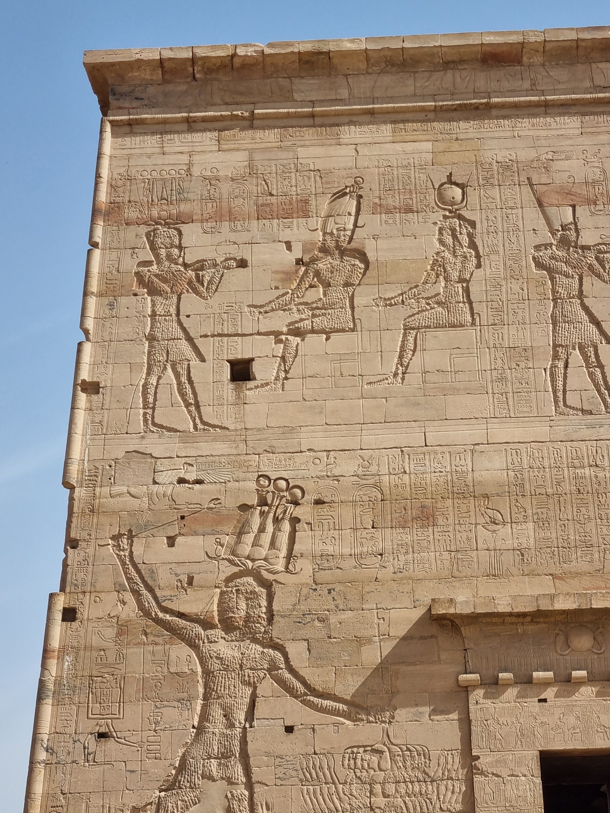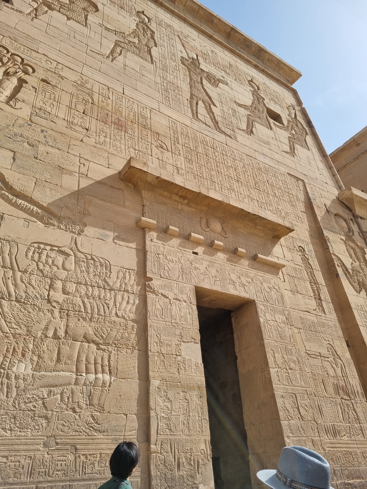 ▲ 이시스 신전의 첫 번째 탑문은 높이 60피트, 너비 150피트 정도로, 양쪽에는 깃대를 세울 용도로 깊은 홈이 파여있다. 대략 프톨레마이오스 2세 시절에 착공해 프톨레마이오스 3세 시절에 대략적인 윤곽이 잡힌 걸로 추정된다. 탑문의 전면에는 이집트의 대적들의 머리를 잡은 채 곤봉으로 내려칠 준비를 하는 프톨레마이오스 12세의 모습이 새겨졌다. 그의 왼쪽에는 왕을 바라보는 이시스가 서 있고, 그 옆에 호루스를 상징하는 매가 있다. 이 장면 위에 두 개의 부조가 있다. 하나는 호루스와 네프티스에게 상이집트와 하이집트의 왕관을 선물하는 프톨레마이오스 12세의 부조, 나머지 하나는 이시스와 어린 호루스에게 향을 바치는 프톨레마이오스 12세의 부조다.