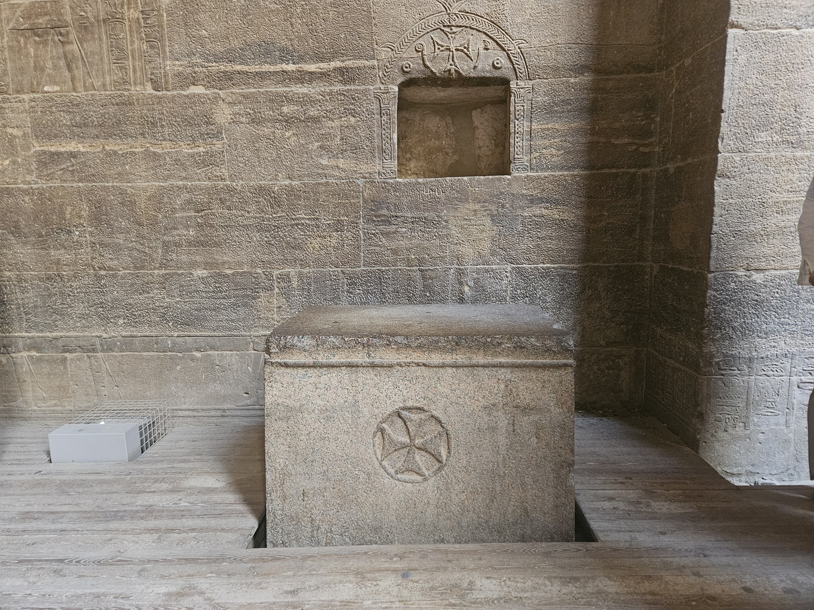 ▲ 3개의 어두운 방들을 지나면 가장 안쪽에 이시스 여신의 내부 성소가 등장한다. 원래는 황금으로 장식되어 있었고, 순금으로 만든 이시스 여신의 신상이 있었으나 지금은 모두 사라진 상태. 성소로 향하는 방에 있는 벽화들을 보면 오시리스를 애도하는 여신들의 모습, 그의 시신 조각들을 찾는 이시스의 모습, 습지 식물들 사이에 안치된 오시리스의 시신, 오시리스와 호루스에게 상하이집트의 왕관을 바치는 네프티스 여신의 모습 등이 있다. 1800년대까지만 해도 이집트 유적들 중에서도 손꼽힐 정도로 벽화의 채색이 화려하게 보존되어 있었으며, 특히 천장이 밤하늘처럼 짙은 푸른색으로 장식되어 있어 매우 아름다웠다고 한다. 그러나 홍수로 인해 침수되면서 색료가 물에 쓸려내려가 현재는 바위 색만 남았다