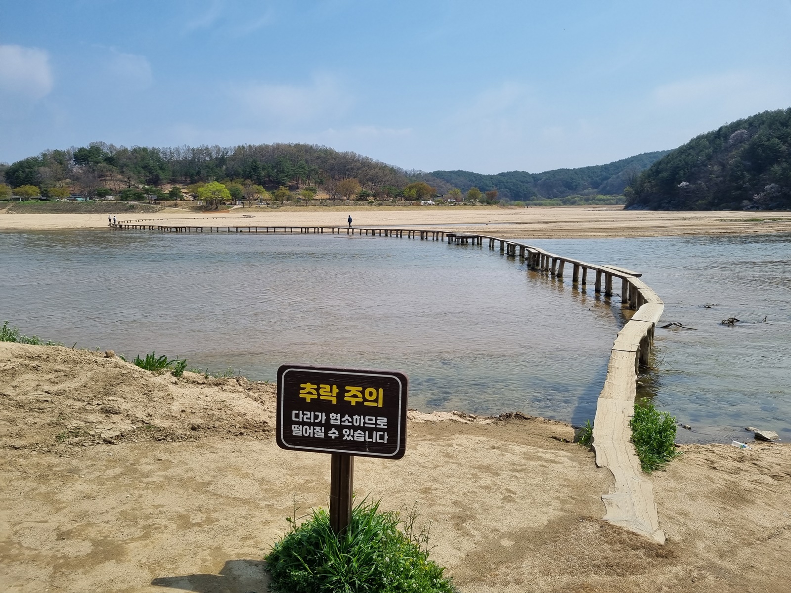 ▲ 외나무 다리. 굽이 굽이 백사장이 펼쳐지고 맑디 맑은 깨끗한 물이 흐르는 내성천 외나무 다리를 건너고. 매년 10월초 무섬 외나무다리 축제가 열린다고 한다