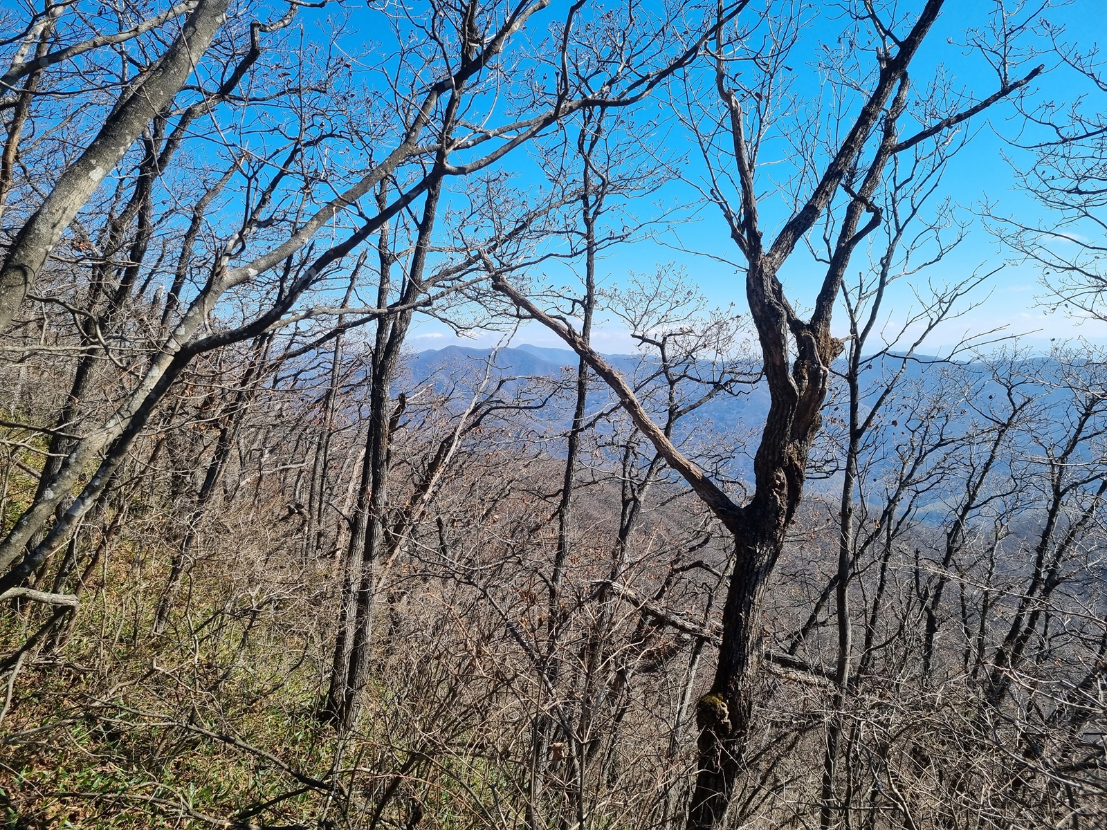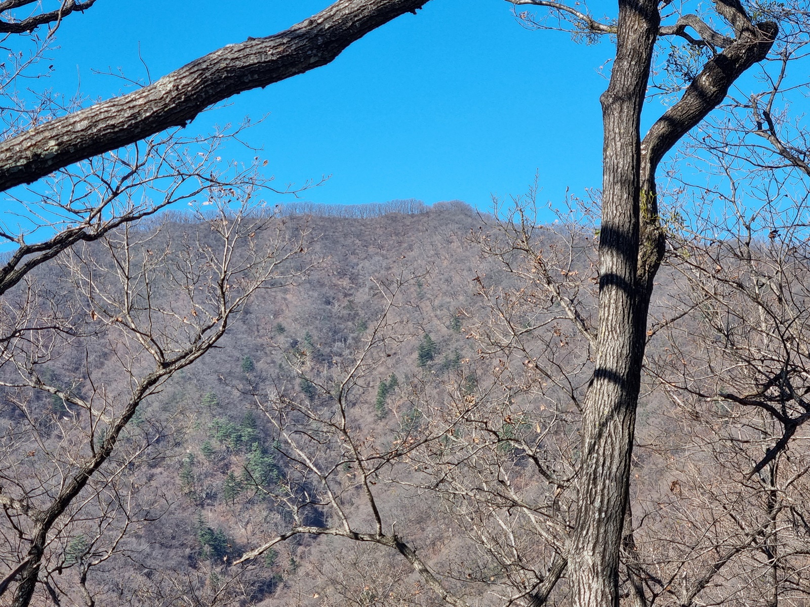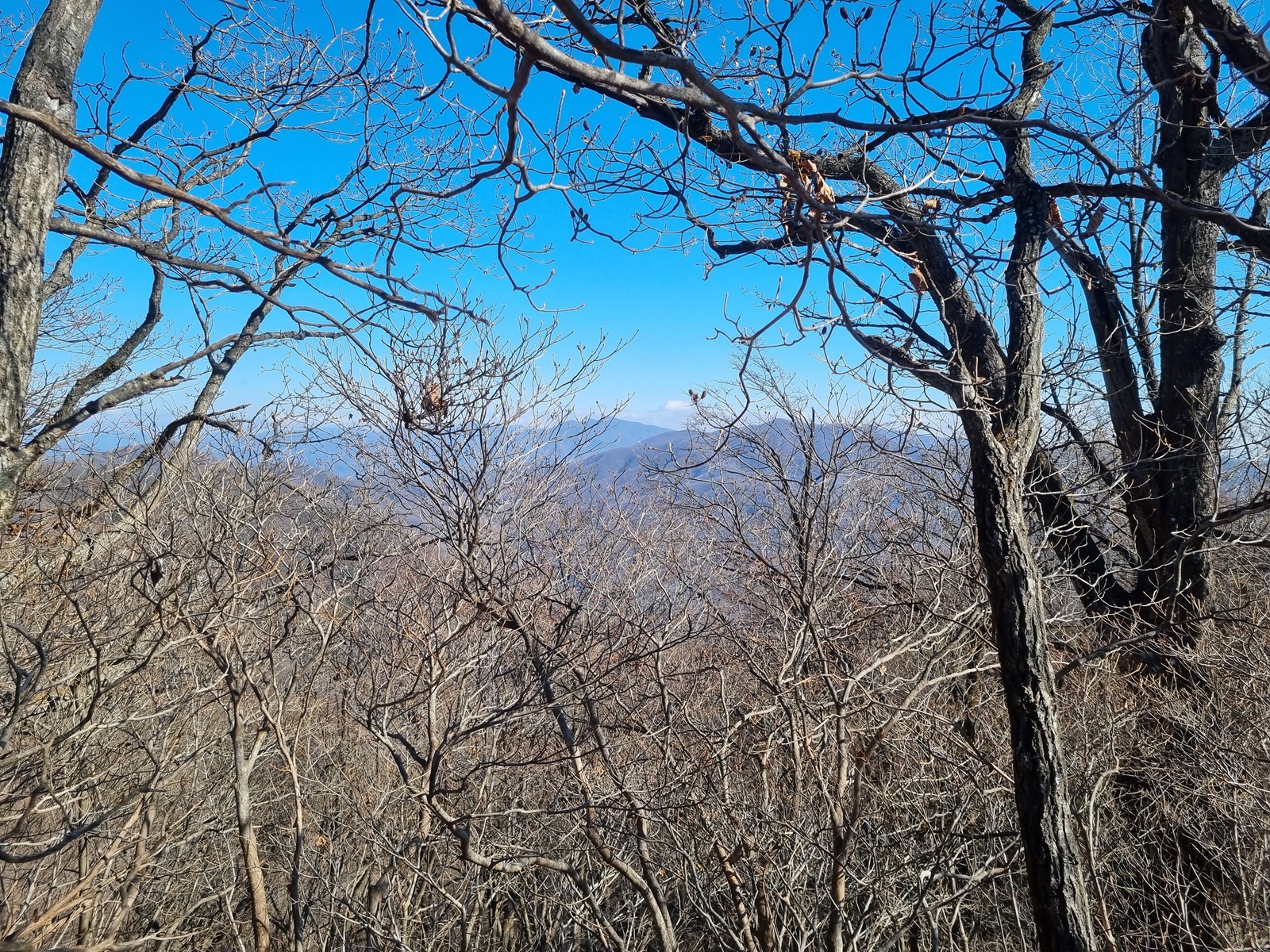 ▲ 우측 나무가지 사이로 살짝 보이는 한강기맥 회령봉 - 계방산 방향을 당겨 보고
