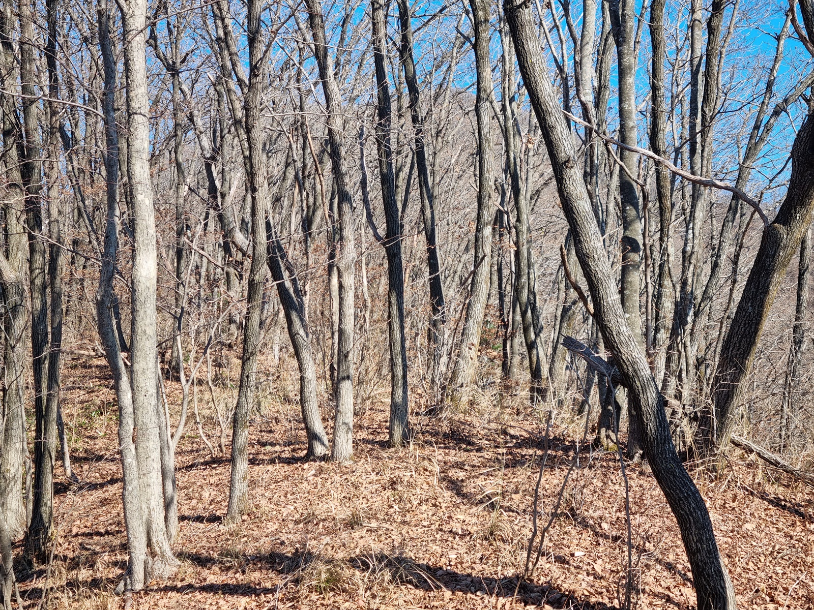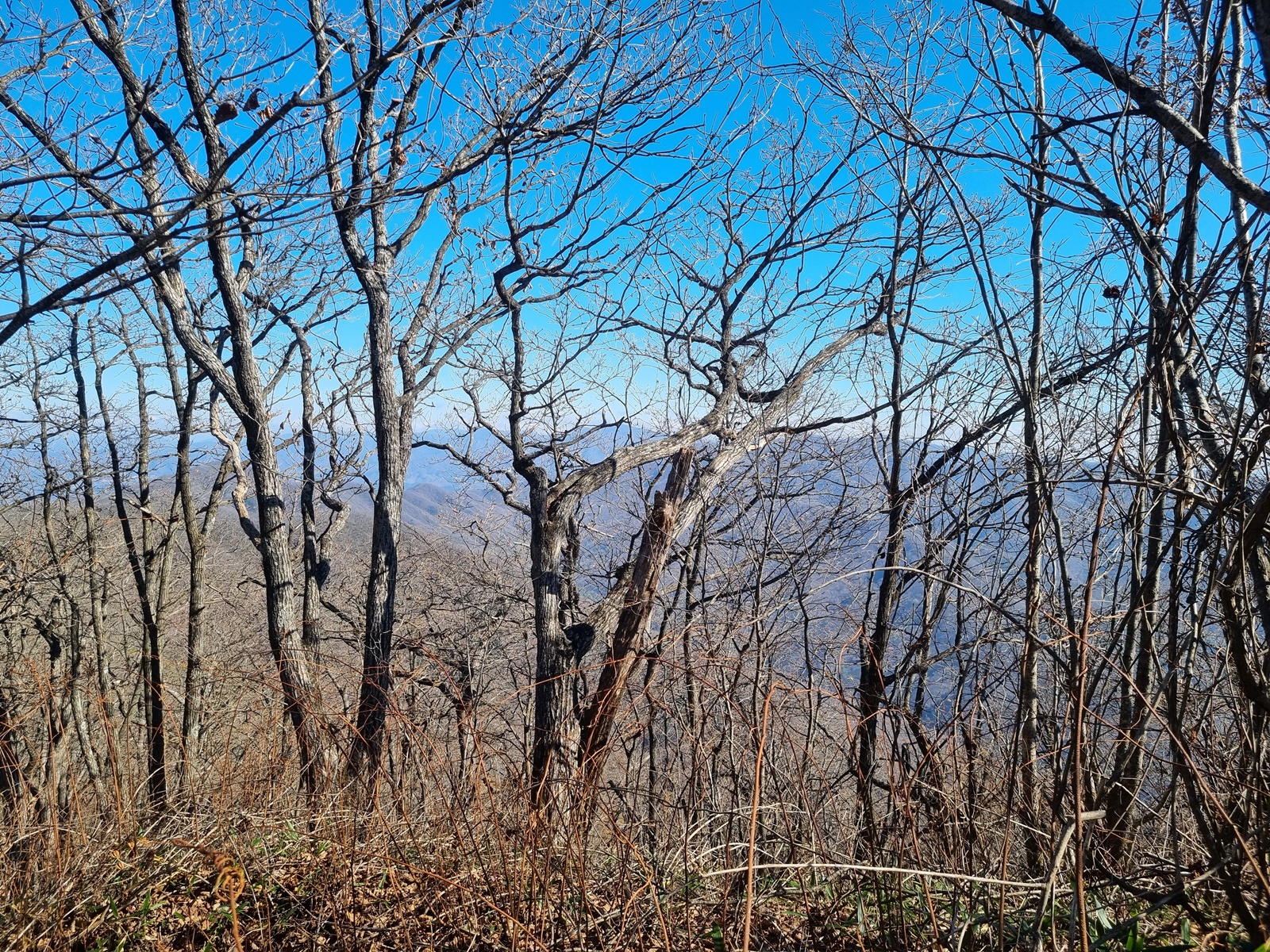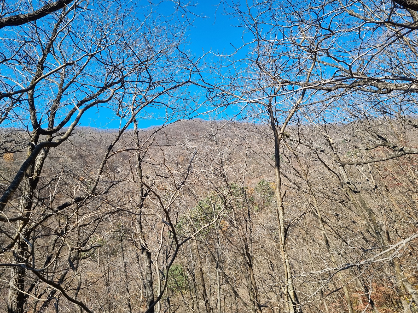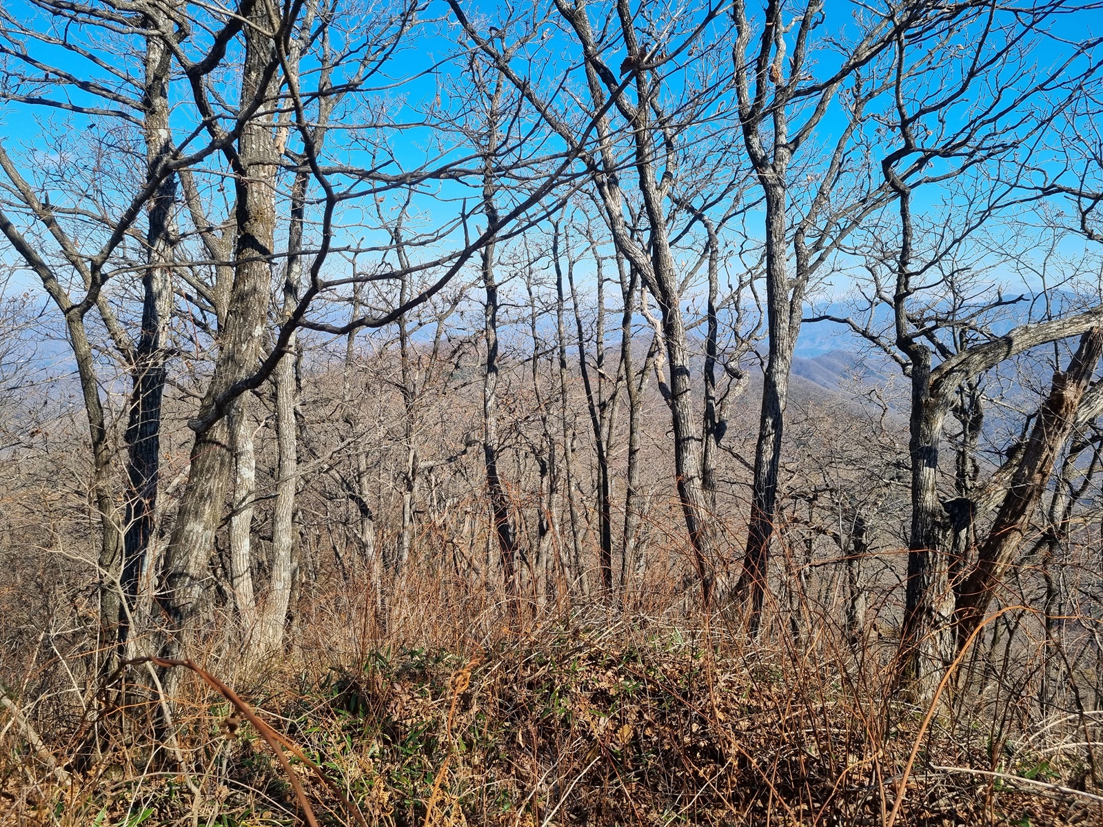 ▲ 우측 나무가지 사이로 살짝 보이는 한강기맥 회령봉 - 계방산 방향을 당겨 보고