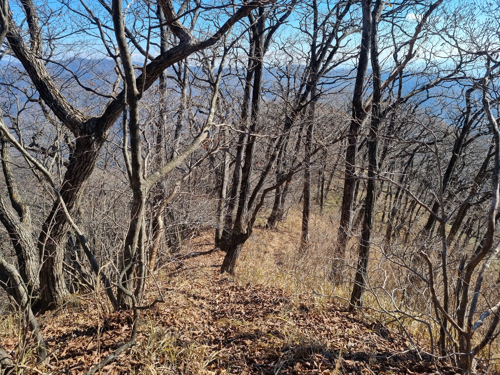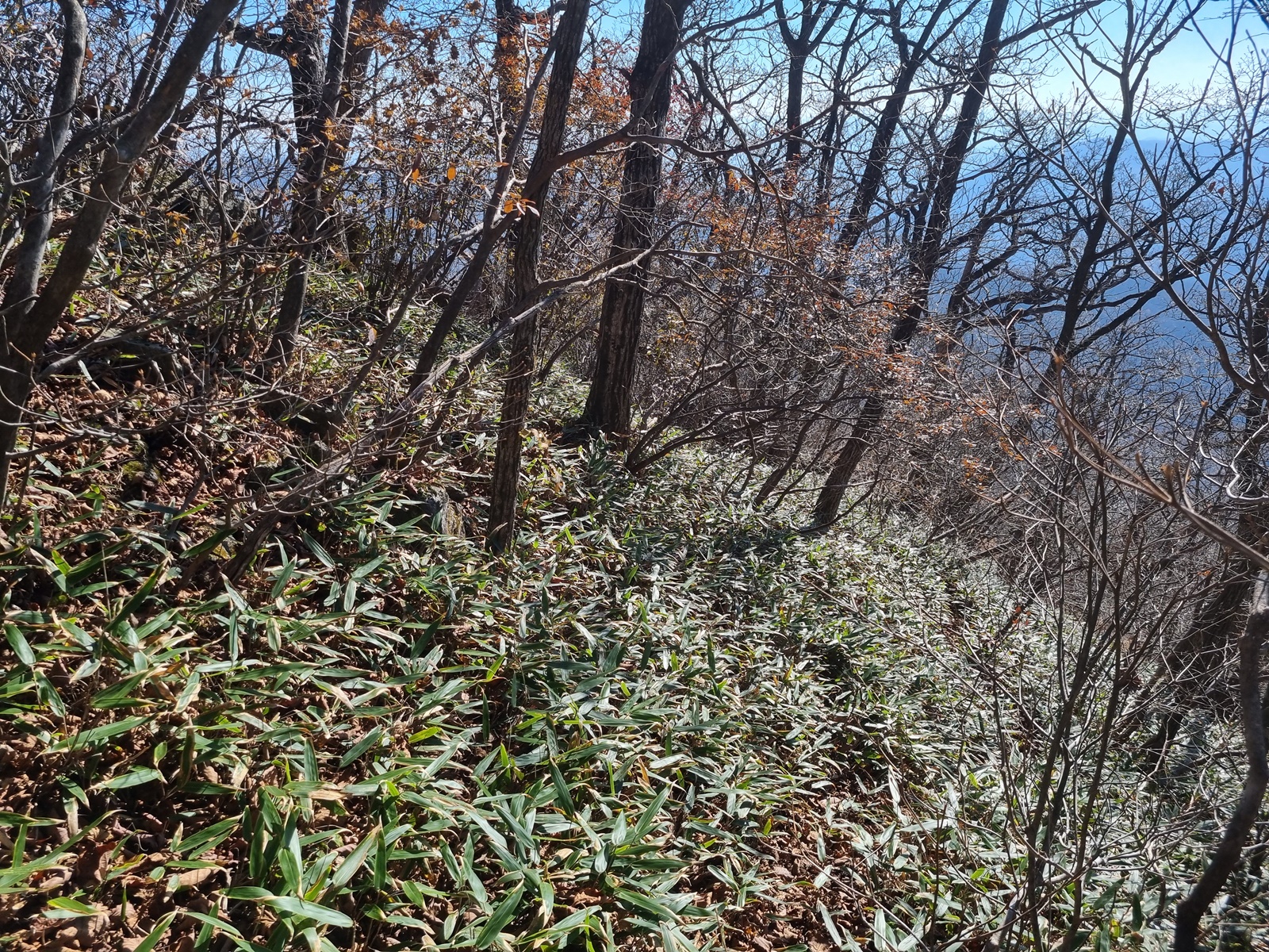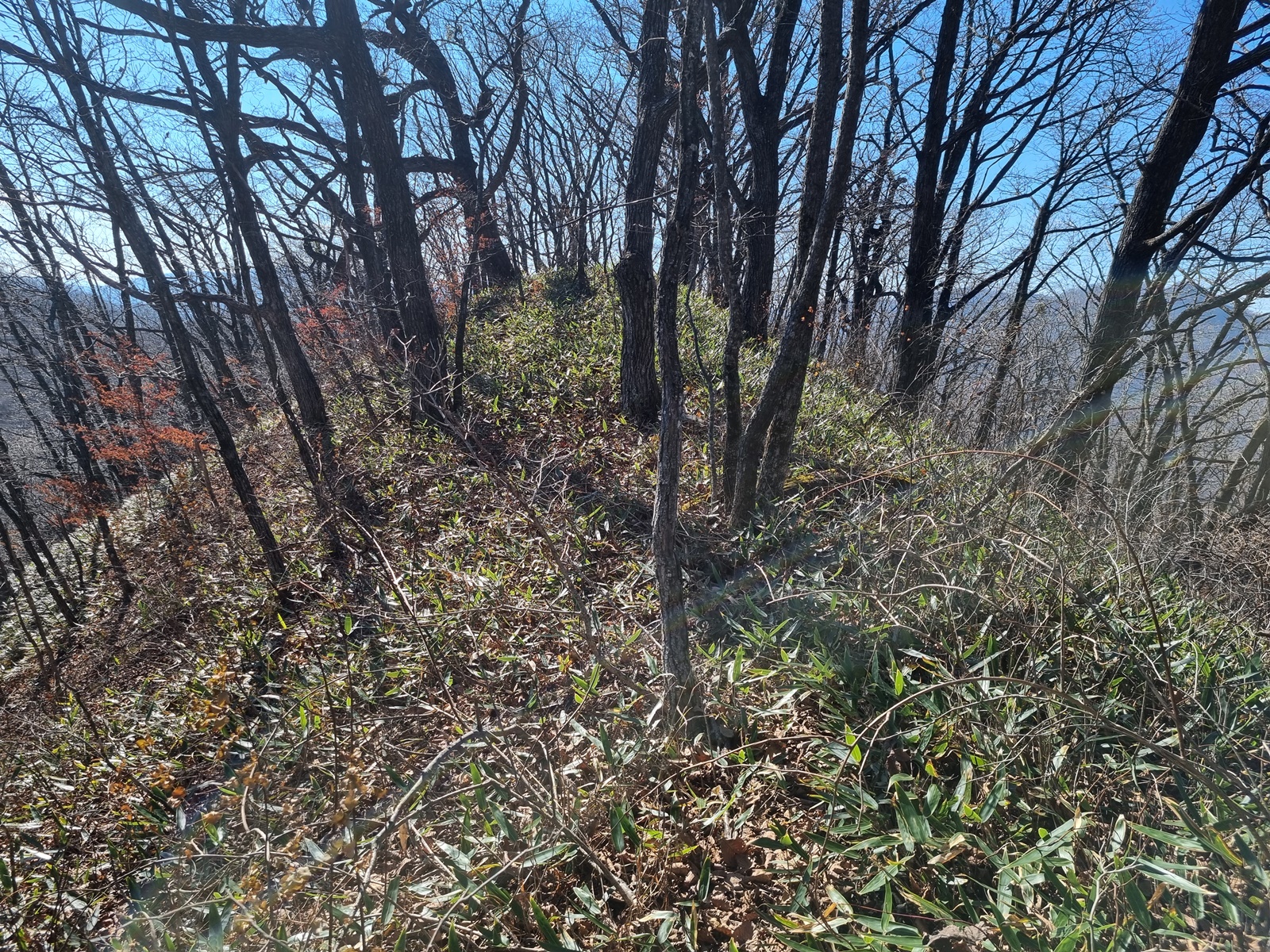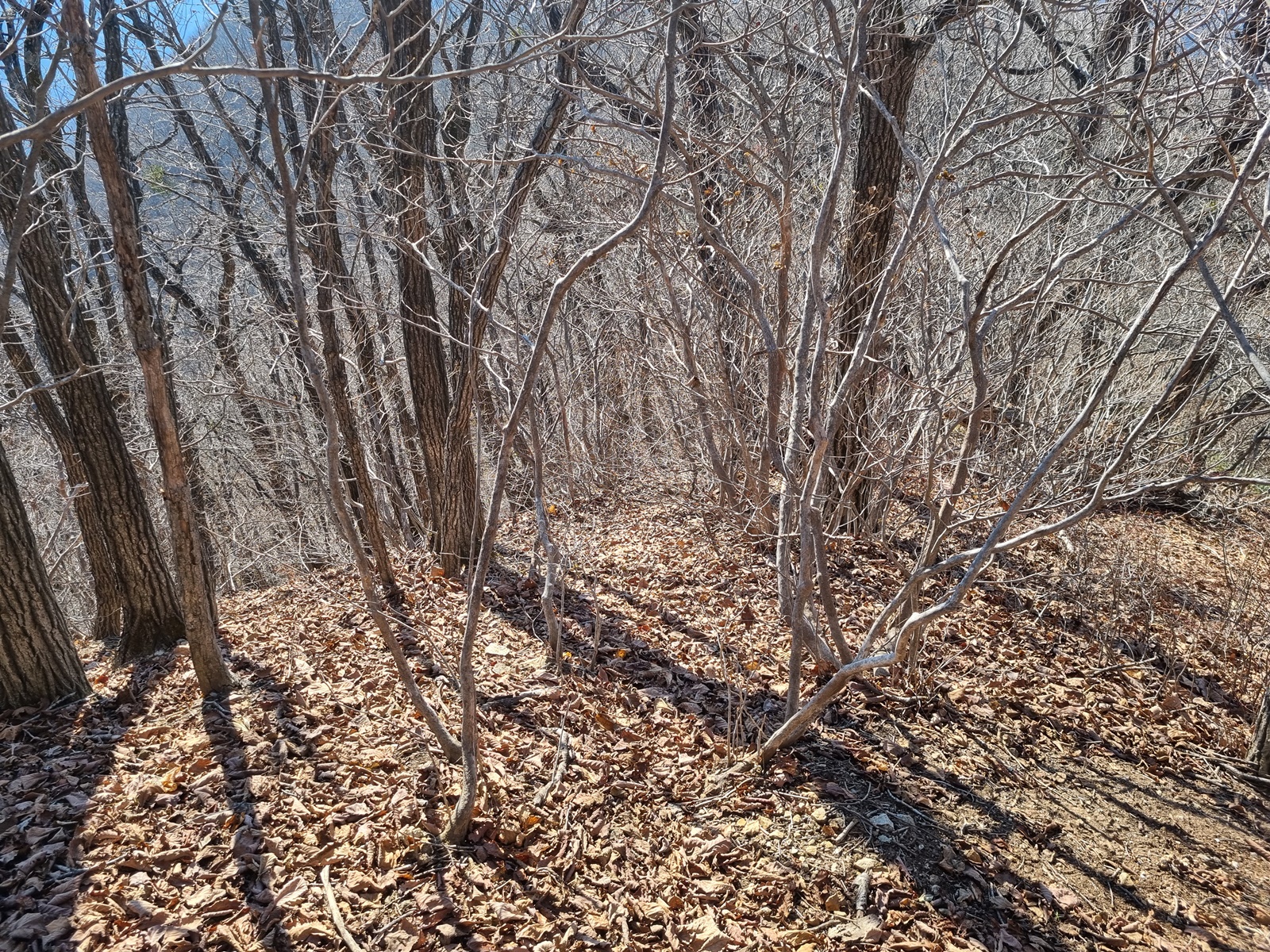 ▲ 내리막 능선 또한 거칠은 급경사. 더하여 잡목들이 얼굴을 때리는 성가신 하산길이다. 두터운 낙엽속에 돌들이 숨어 있어 미끄러지지 않도록 조심조심 내려 온다