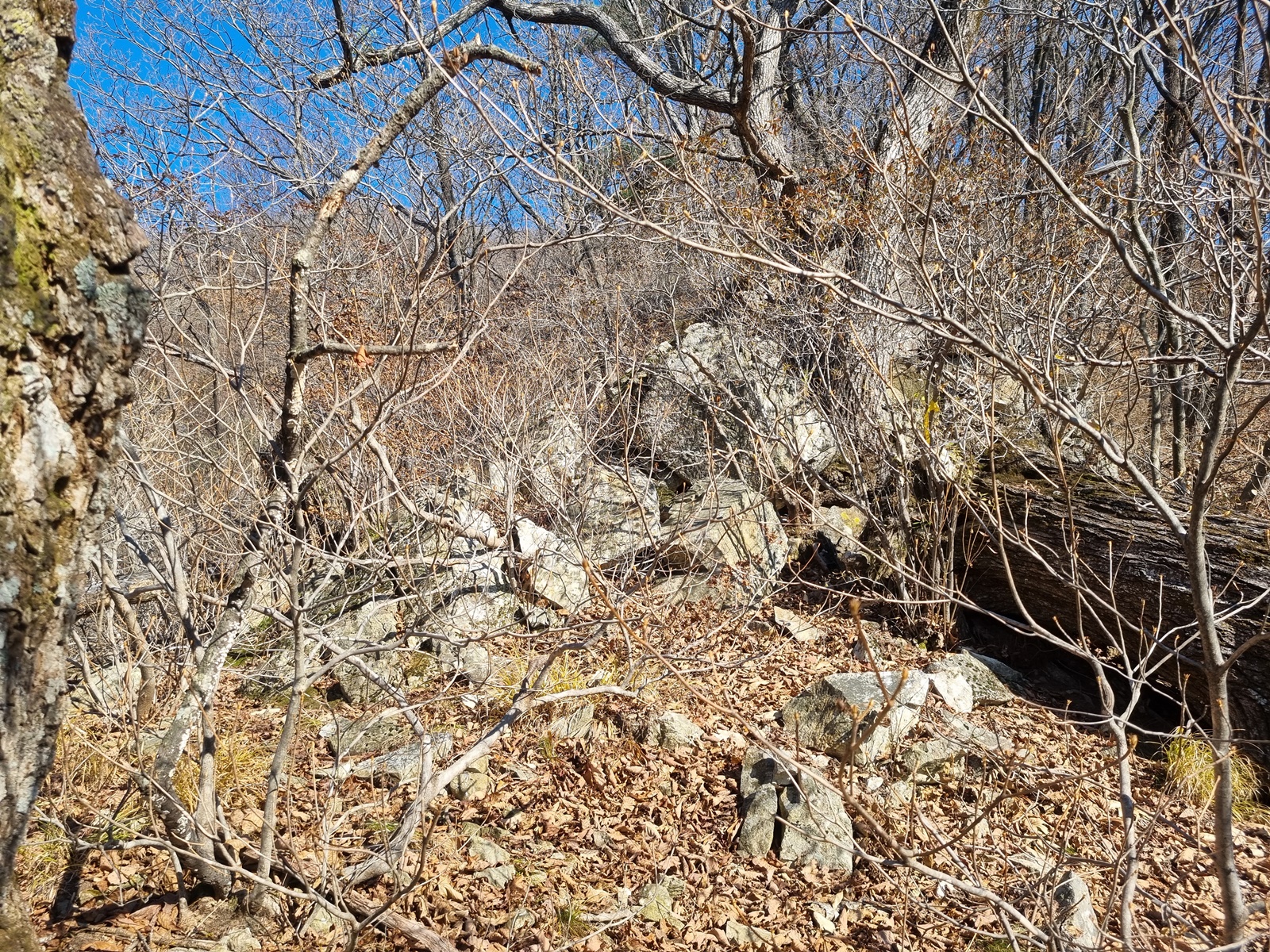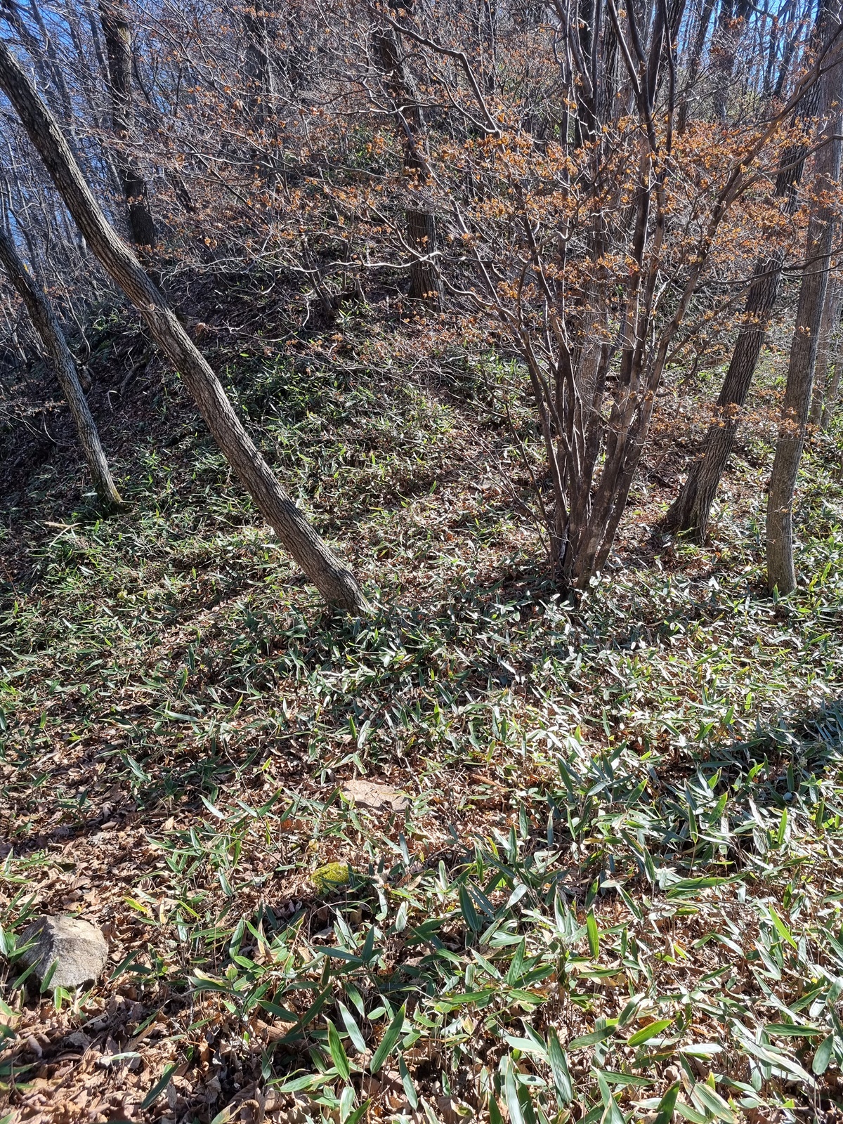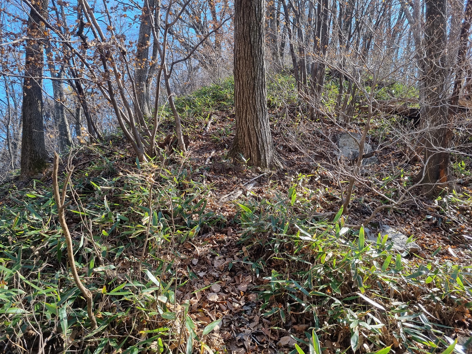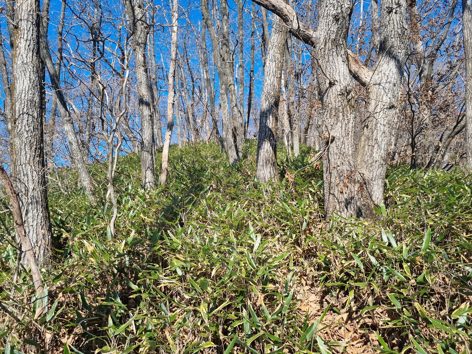 ▲ 내리막 능선 또한 거칠은 급경사. 더하여 잡목들이 얼굴을 때리는 성가신 하산길이다. 두터운 낙엽속에 돌들이 숨어 있어 미끄러지지 않도록 조심조심 내려 온다