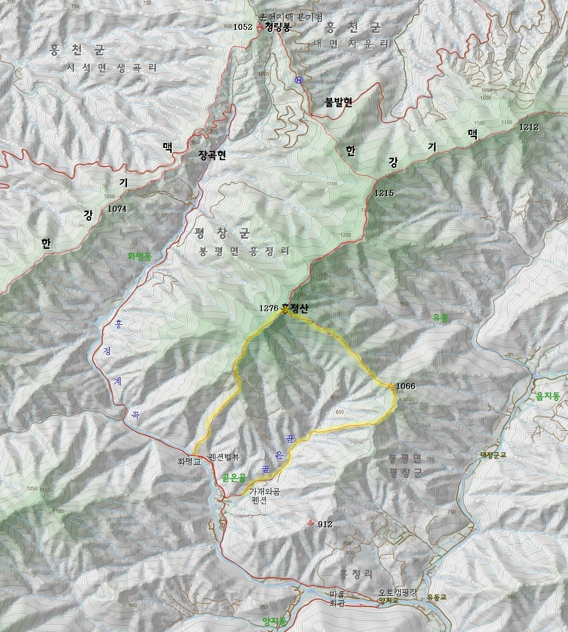 ▷ 산행 총거리 5.4㎞(GPS거리) : 흥정계곡 화명교 –2.0- 흥정산 정상 –1.3- 1066 삼각점봉 –1.1- 곧은골 –1.0- 가재와곰 펜션