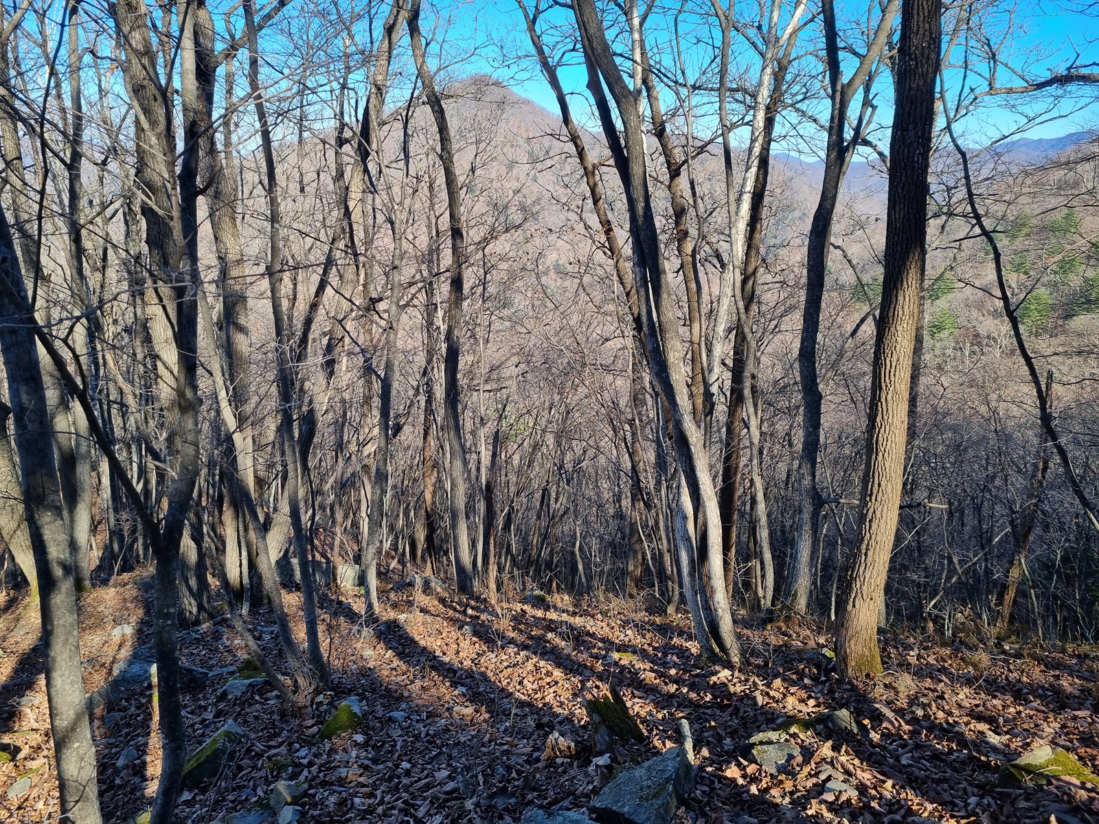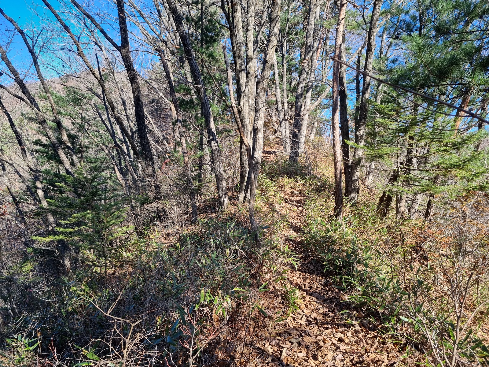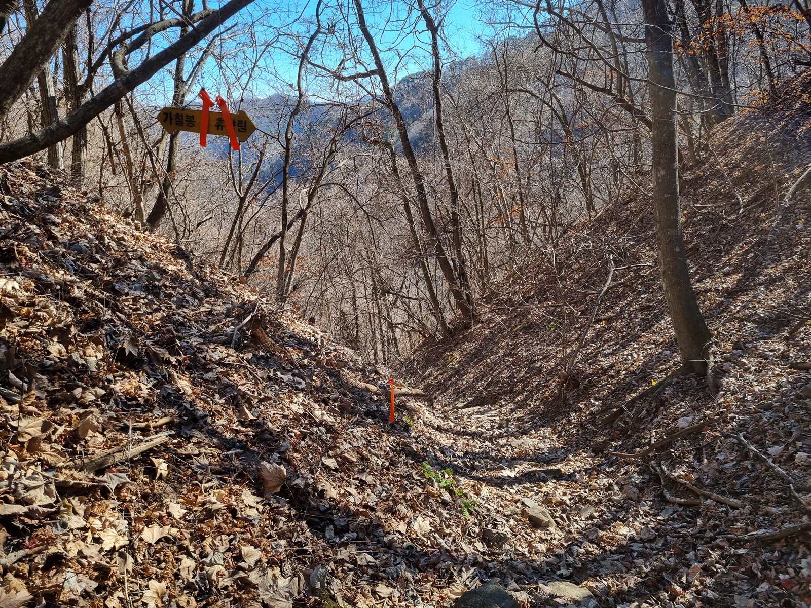 ▲ 완만한 오르막으로 매봉령 능선을 향해 오른다. 낙엽이 쌓이고 인적이 드문 길이라 길찾기가 쉽지 않다