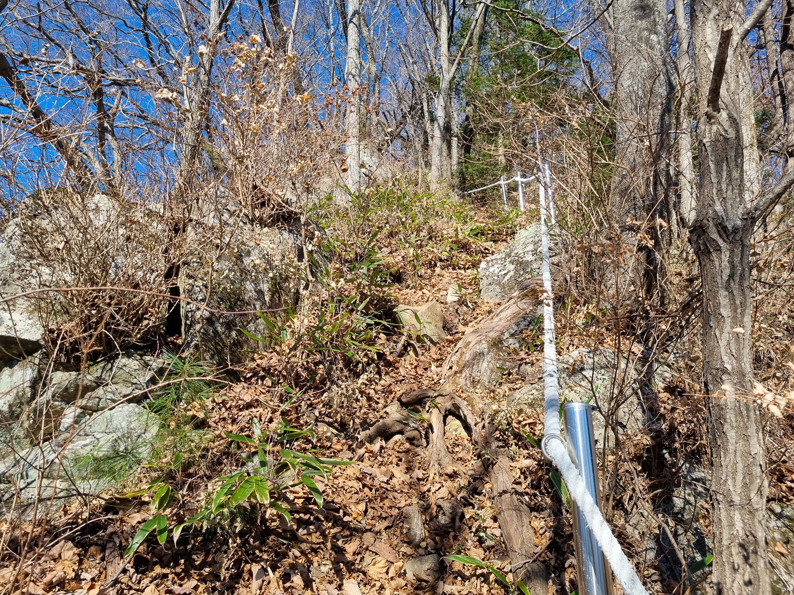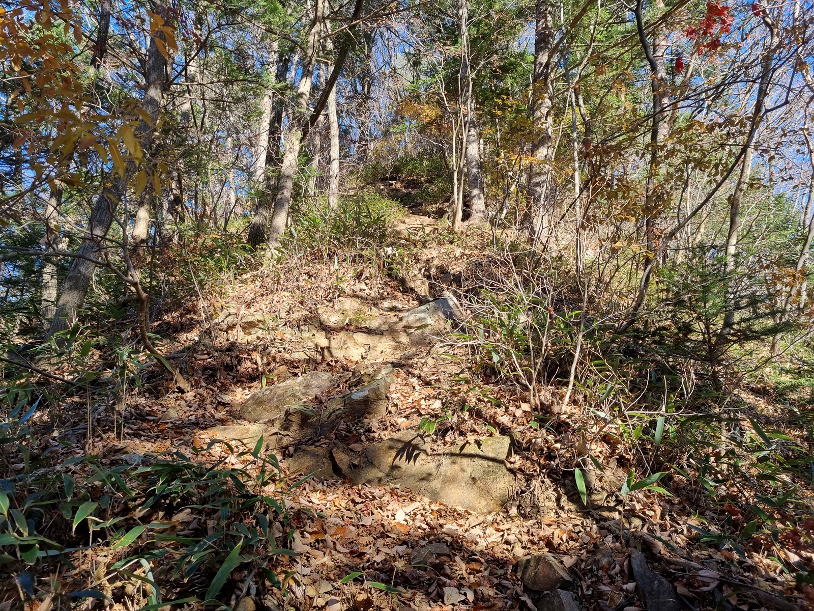 ▲ 암릉구간이 나타나며 길이 거칠어 진다. 희미한 길도 낙엽에 묻혀 버리고 생각보다 어렵게 어찌어찌 봉우리 2개를 오르고 나서야