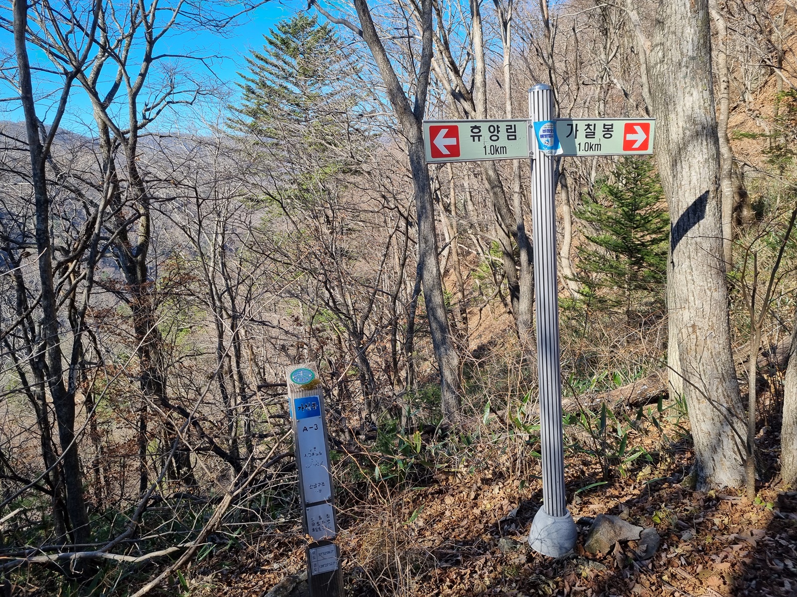 ▲ 주능선에 올라서자 실론계곡으로 내려가는 갈림길 삼거리가 나타난다. 이 곳에서 가칠봉 정상까지 왕복해야 한다