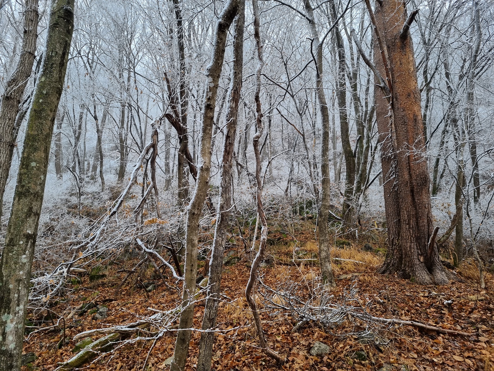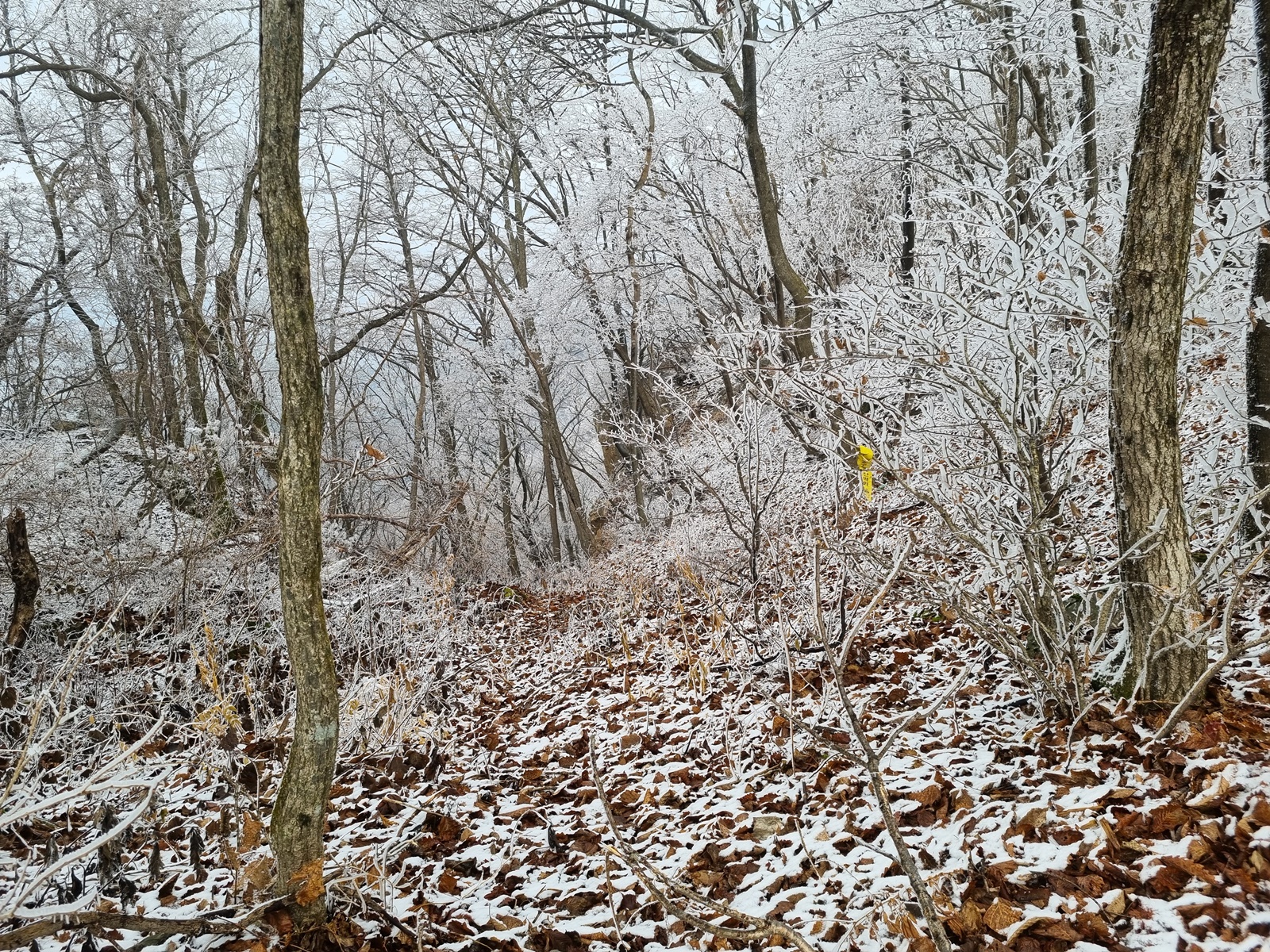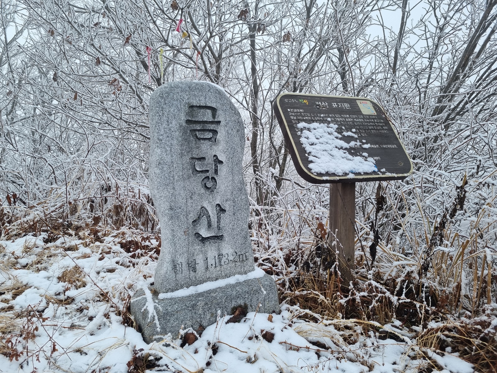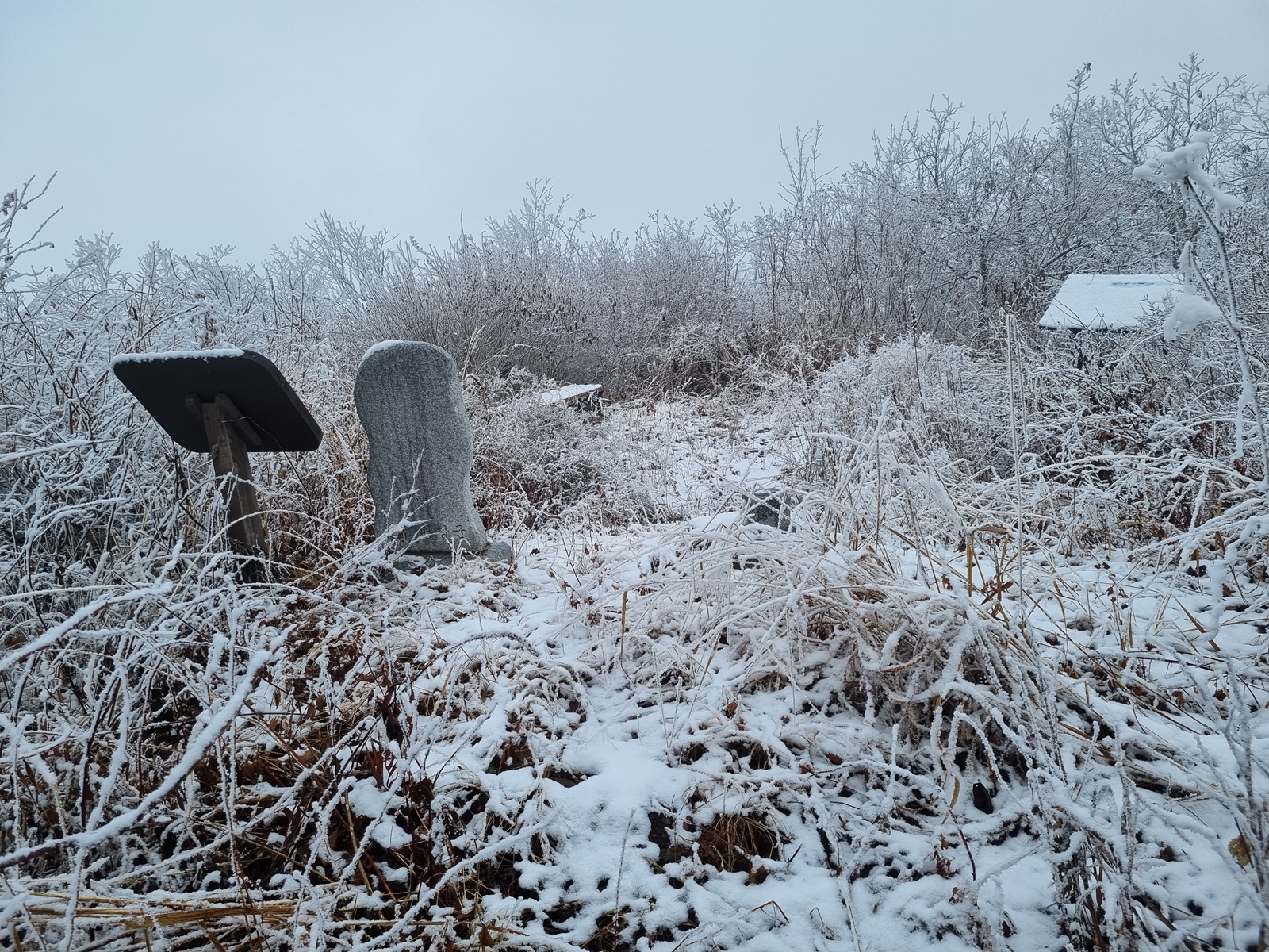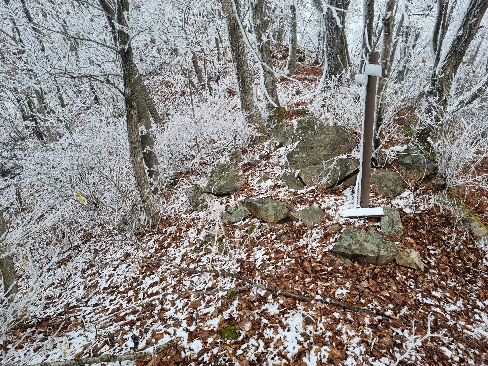 ▲ 헌데, 금당산과 고두산 정상 봉우리 분위기가 심상치 않다. 서리가 내린듯 하얀 고깔에 짙은 운무까지. 내심 걱정을 하면서 오후에는 구름이 물러가고 햇빛이 날거라는 일기예보를 기대하였지만, 결과는 강원도 1000 고지 이상은 벌써 겨울이 시작되었다는 것. 정상부 능선은 온통 눈밭에 너덜지대와 덩굴잡목까지. 아이젠 없이 거문산-고두산을 거쳐 길없는 급경사 계곡을 치고 내려와 백암동으로 원점회귀하는 위험한 산행은 포기하고 금당산 정상만 찍고 하산하는 것으로 산행계획을 변경하게 된다