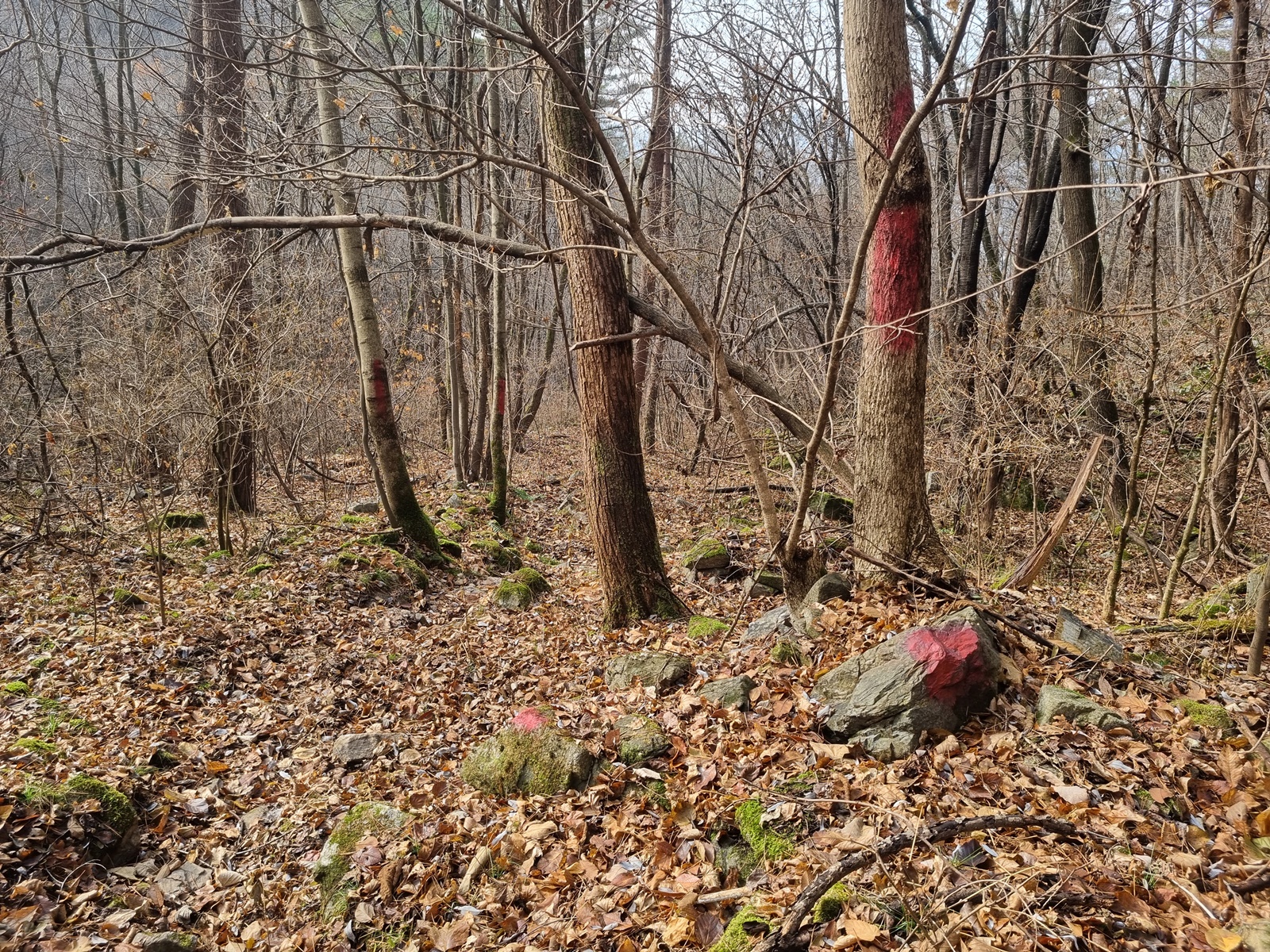 ▲ 주변 바위와 나무에 붉은색 페이트가 칠해져 있는 길을 따라 하산