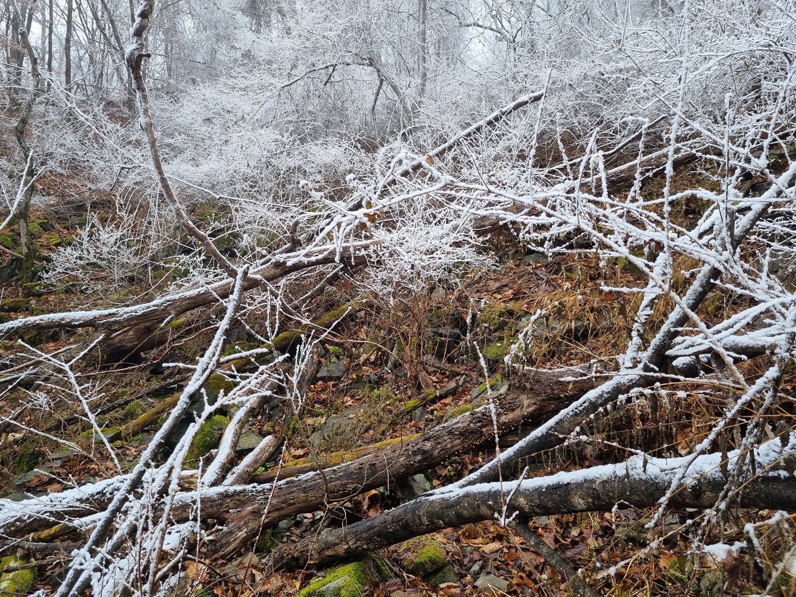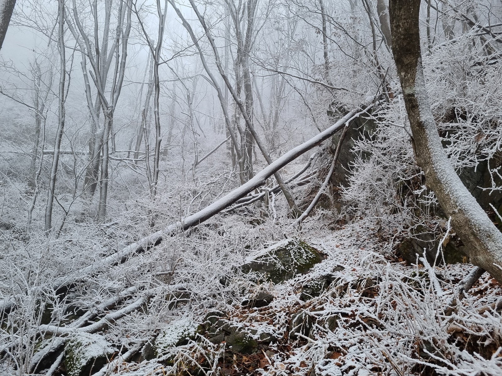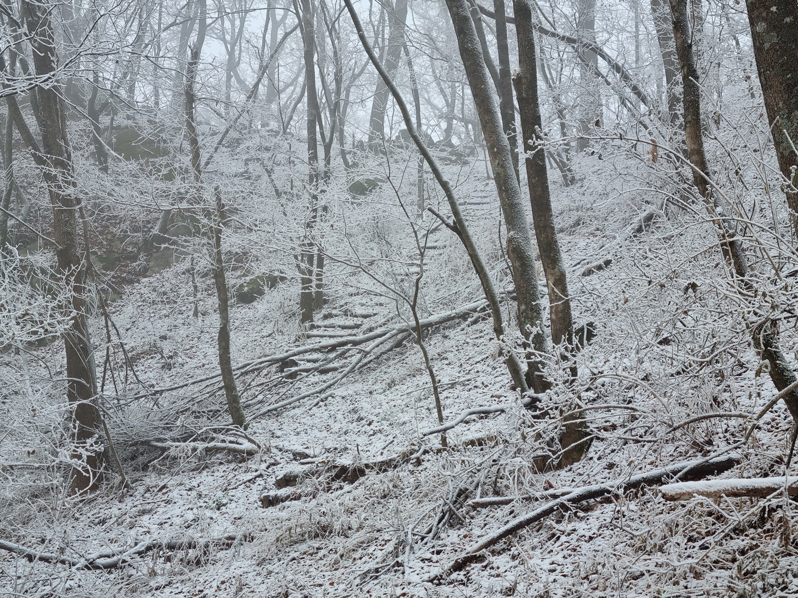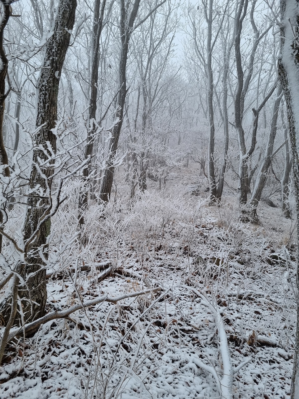 ▲ 밧줄구간이 끝나니 길은 없어지고 너덜지대 덩굴잡목이 빼곡한 구간이 나타난다. 쏟아져 내리는 눈꽃을 원없이 맞아가며 어렵게 어렵게 덩굴구간을 뚫고 오르고