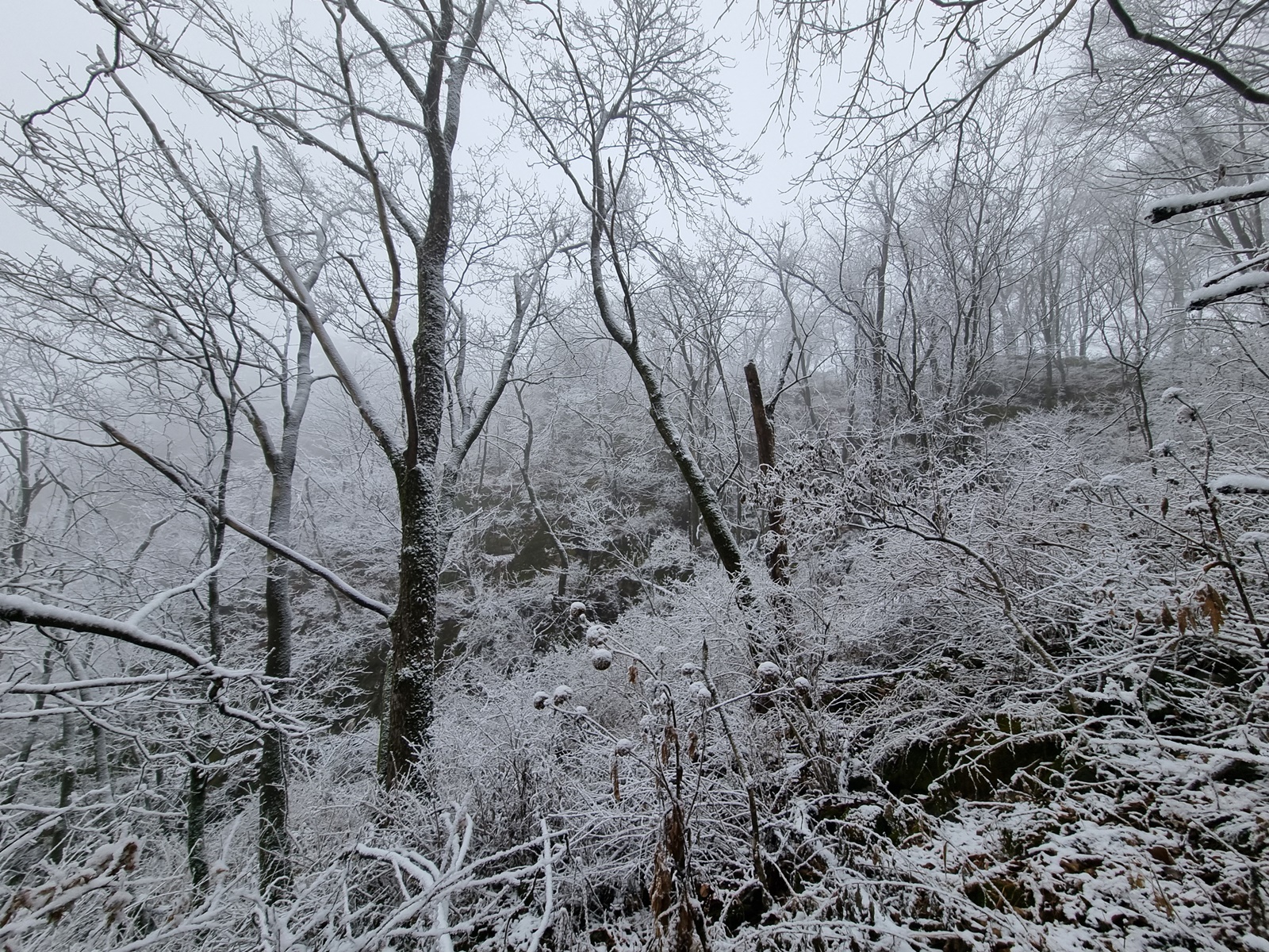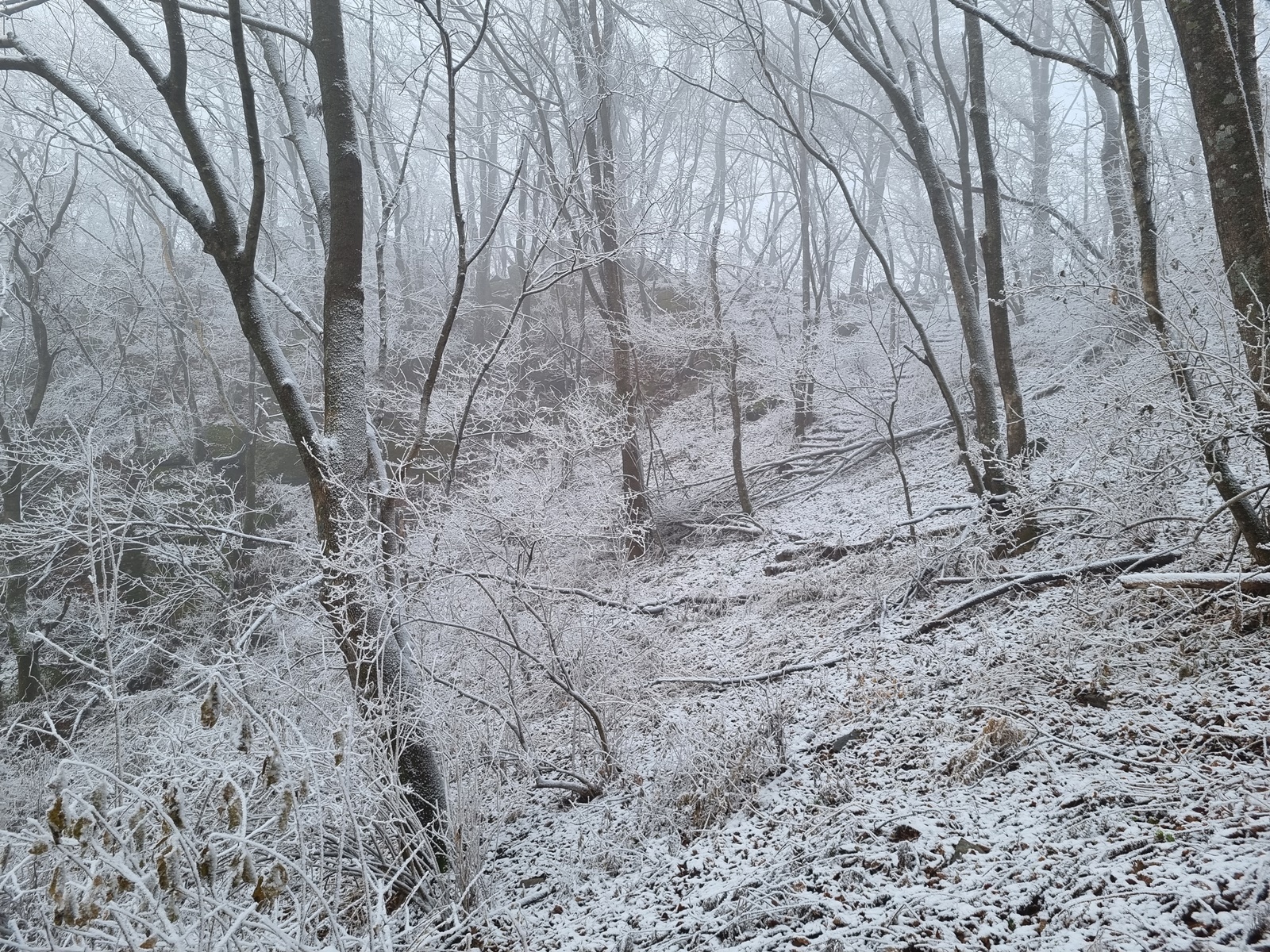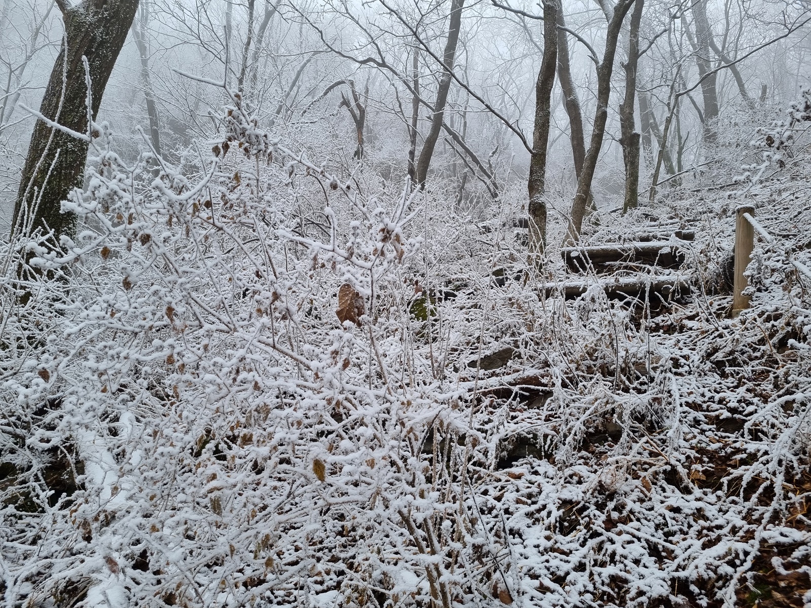 ▲ 밧줄구간이 끝나니 길은 없어지고 너덜지대 덩굴잡목이 빼곡한 구간이 나타난다. 쏟아져 내리는 눈꽃을 원없이 맞아가며 어렵게 어렵게 덩굴구간을 뚫고 오르고