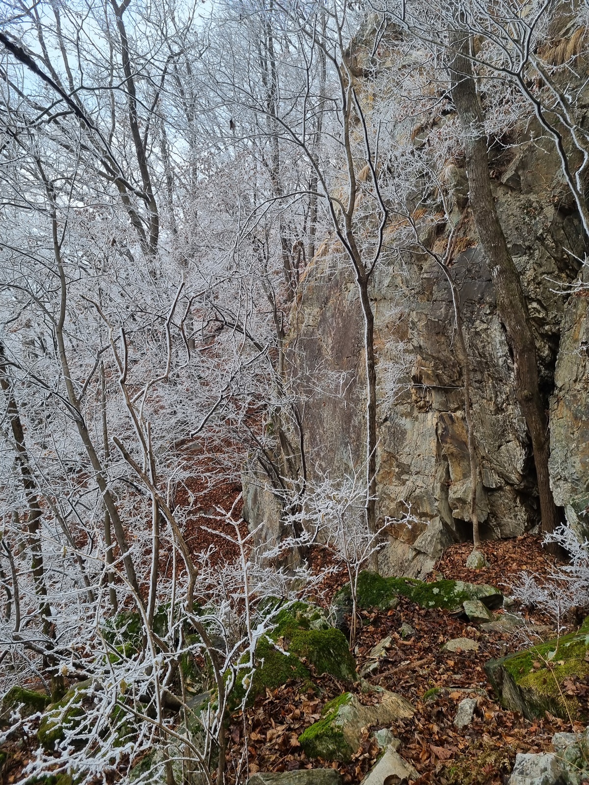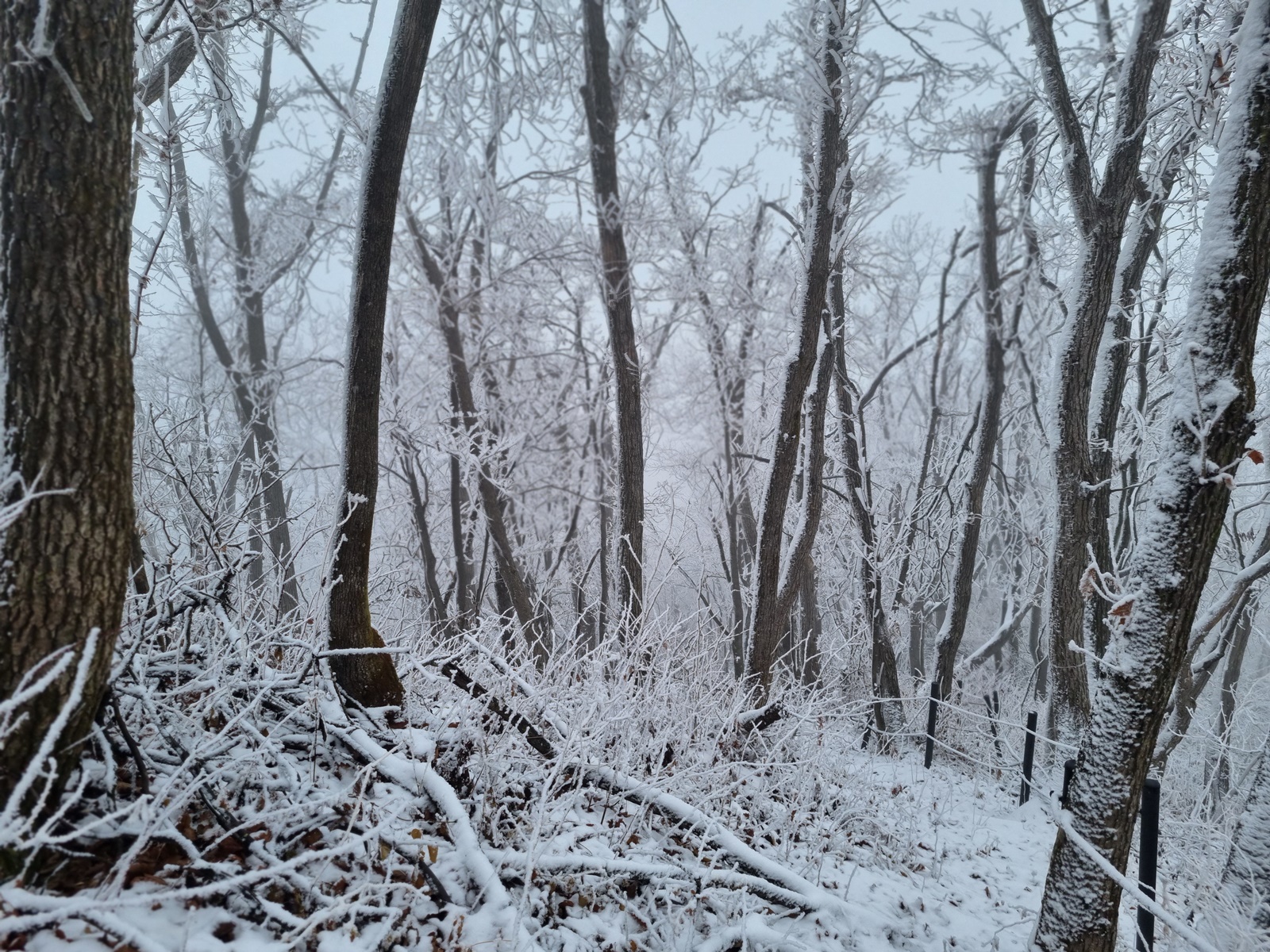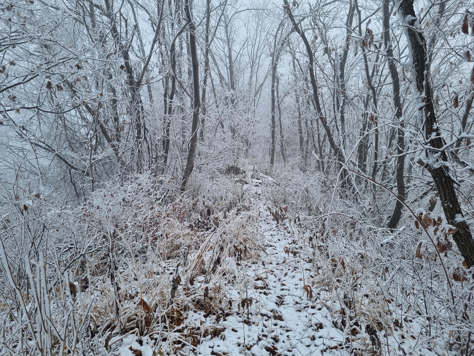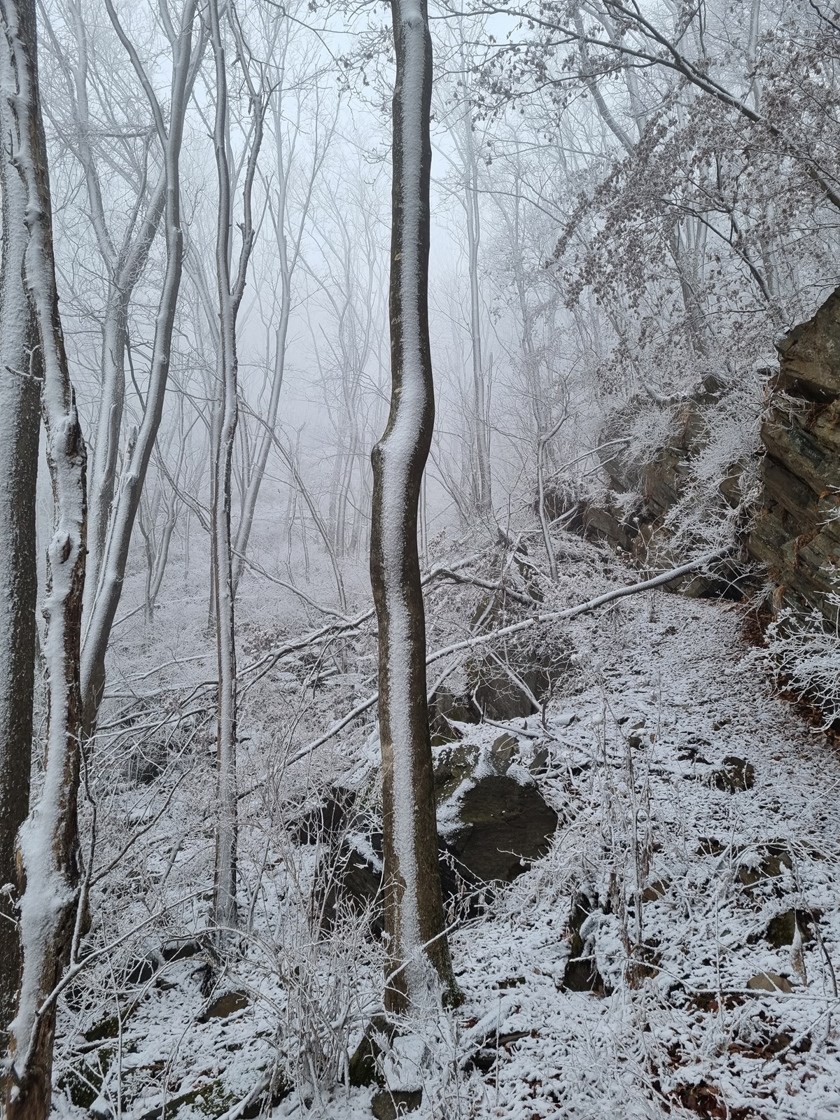 ▲ 밧줄구간이 끝나니 길은 없어지고 너덜지대 덩굴잡목이 빼곡한 구간이 나타난다. 쏟아져 내리는 눈꽃을 원없이 맞아가며 어렵게 어렵게 덩굴구간을 뚫고 오르고
