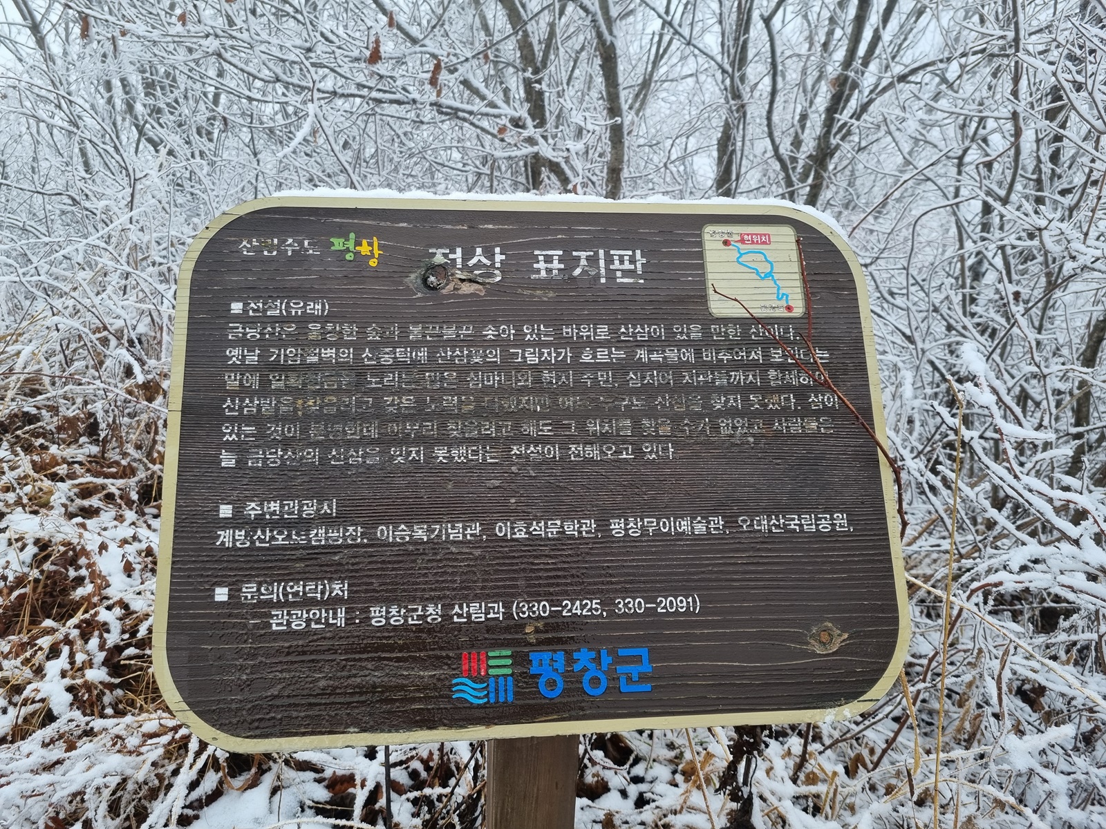 ▷ 산행 총거리 6.0㎞(GPS거리) : 평창 용평 재산리 백암동 –1.2- 금당사 –1.6- 금당산(1173m) 정상 –0.9- 평창역 금당동 갈림길 삼거리 –2.3- 금당동