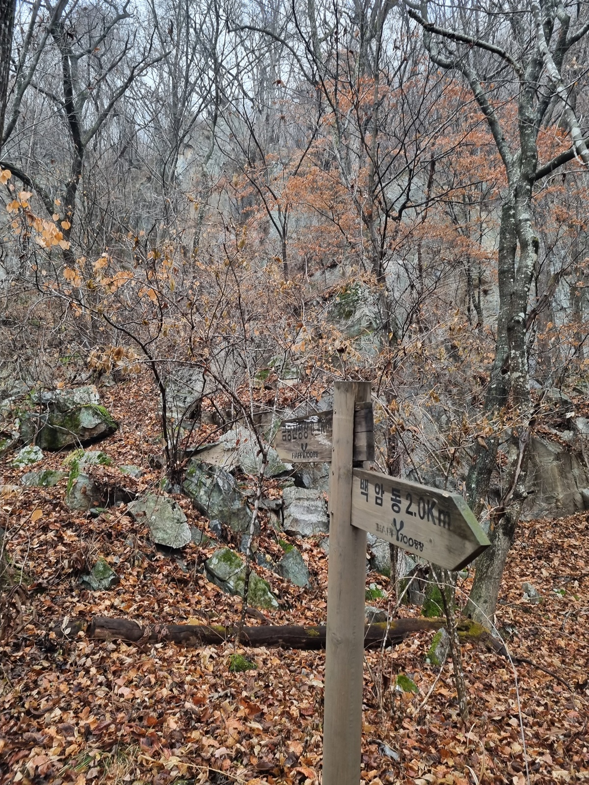 ▲ 모처럼 이정표를 만난다. 백암동 정상까지 오르는 동안 딱 두번 이정표를 만나는데 산행리본은 아예 보이지 않는다. 본격적인 암릉구간이 시작되고