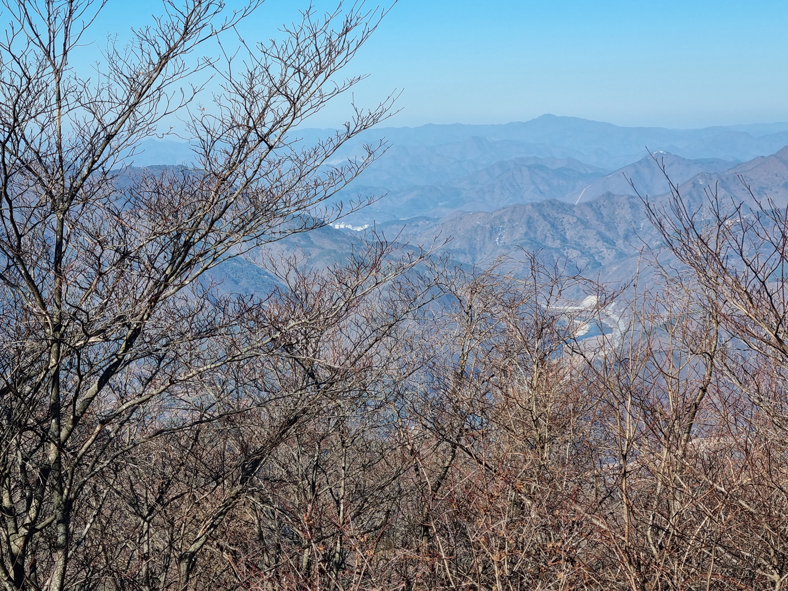 ▲ 정상은 숲속에 묻혀 있어 조망이 트이지 않는다. 나무가지 사이로 태화산 너머 영월쪽을 당겨 보고. 가까이는 계족산과 봉래산. 저 멀리는 백덕산 능선이 보인다