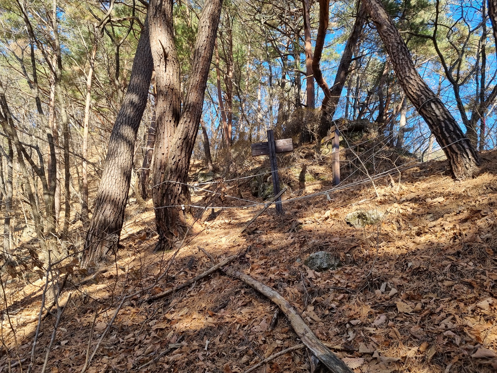 ▲ 급경사로 오르자 등산로 아님 이정표가 서있고. 지금 올라온 길은 밧줄이 쳐져있는 통행금지 구역임을 이 곳에서 알게된다
