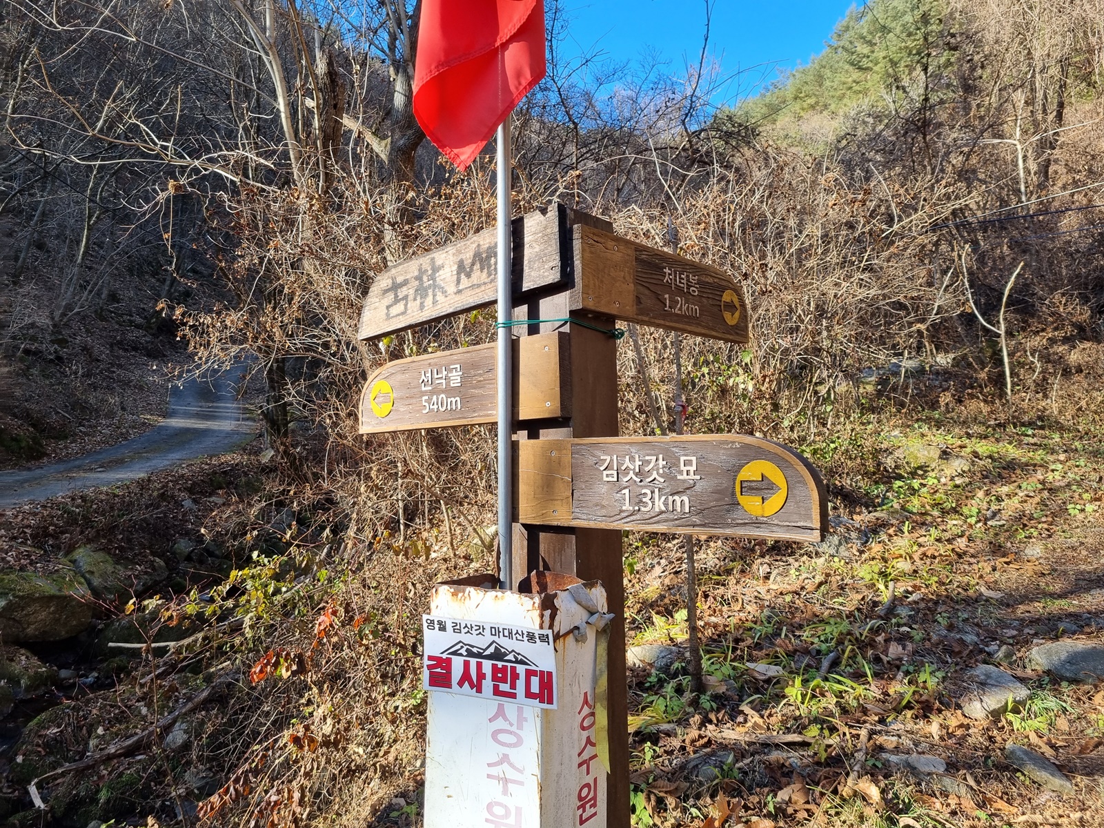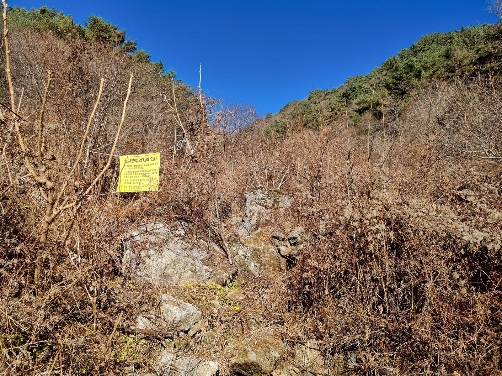 ▲ 산사태취약지역 안내문이 걸려있는 작은 골짜기는 길이 없어져 잠시 헤메고