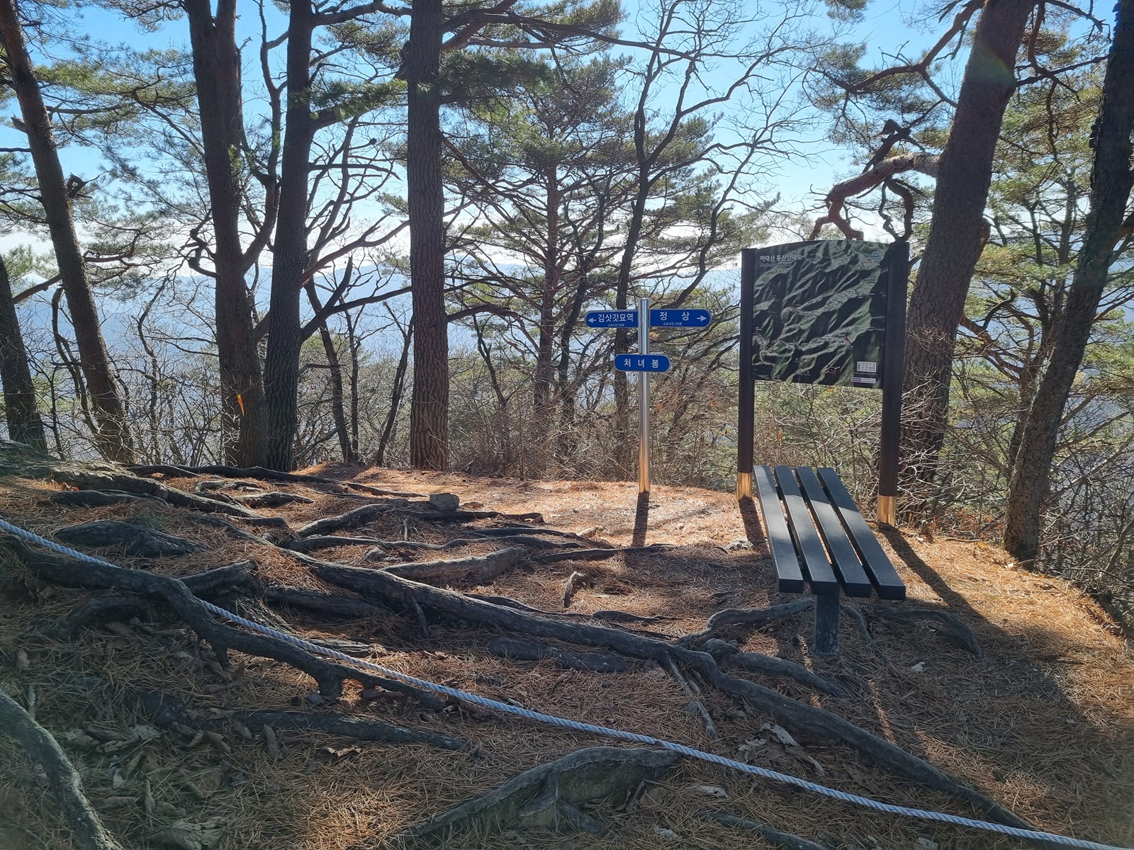 ▲ 봉우리 한가운데 커다란 소나무들이 자리하고 있는 처녀봉(930m) 정상 도착